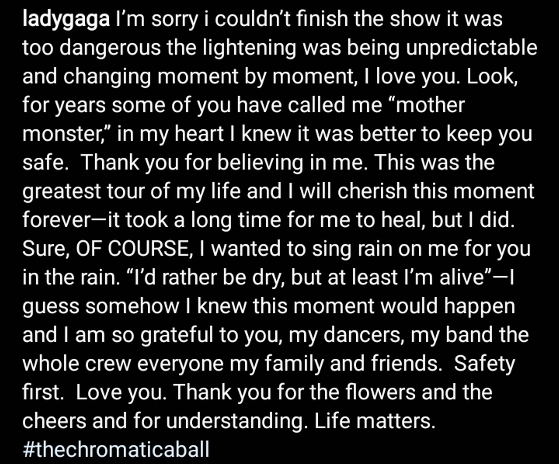 Грандиозный тур Chromatica Ball по всей логике должен был завершиться бурными овациями и выходами на бис — но судьба распорядилась иначе. Закончилось все в гримерке, где певица записала слезное видео для фанатов. В нем она извинилась за то, что была вынуждена прервать концерт. Мы сразу заволновались, что Леди Гага, как и The Weeknd пару недель назад, сорвала голос, но оказалось, что виной всему стала… эпическая гроза. Когда молния ударила совсем рядом, звезда приняла решение остановить шоу. «Я всегда хотела быть такой хардкорной плохой сучкой, но еще я хочу быть ответственной, — поделилась певица. — Я не знаю, что бы я сделала, если бы что-то случилось с кем-нибудь в зале, с любым членом моей команды, моей группы, моего балета». Верные фанаты, конечно же, смогли понять и простить любимую исполнительницу, вот только расходиться им уж очень не хотелось. Поэтому они продолжили развлекаться уже без «мамы монстров» и начали заклинать дождь песней Rain on Me. За что им тут же прилетело!