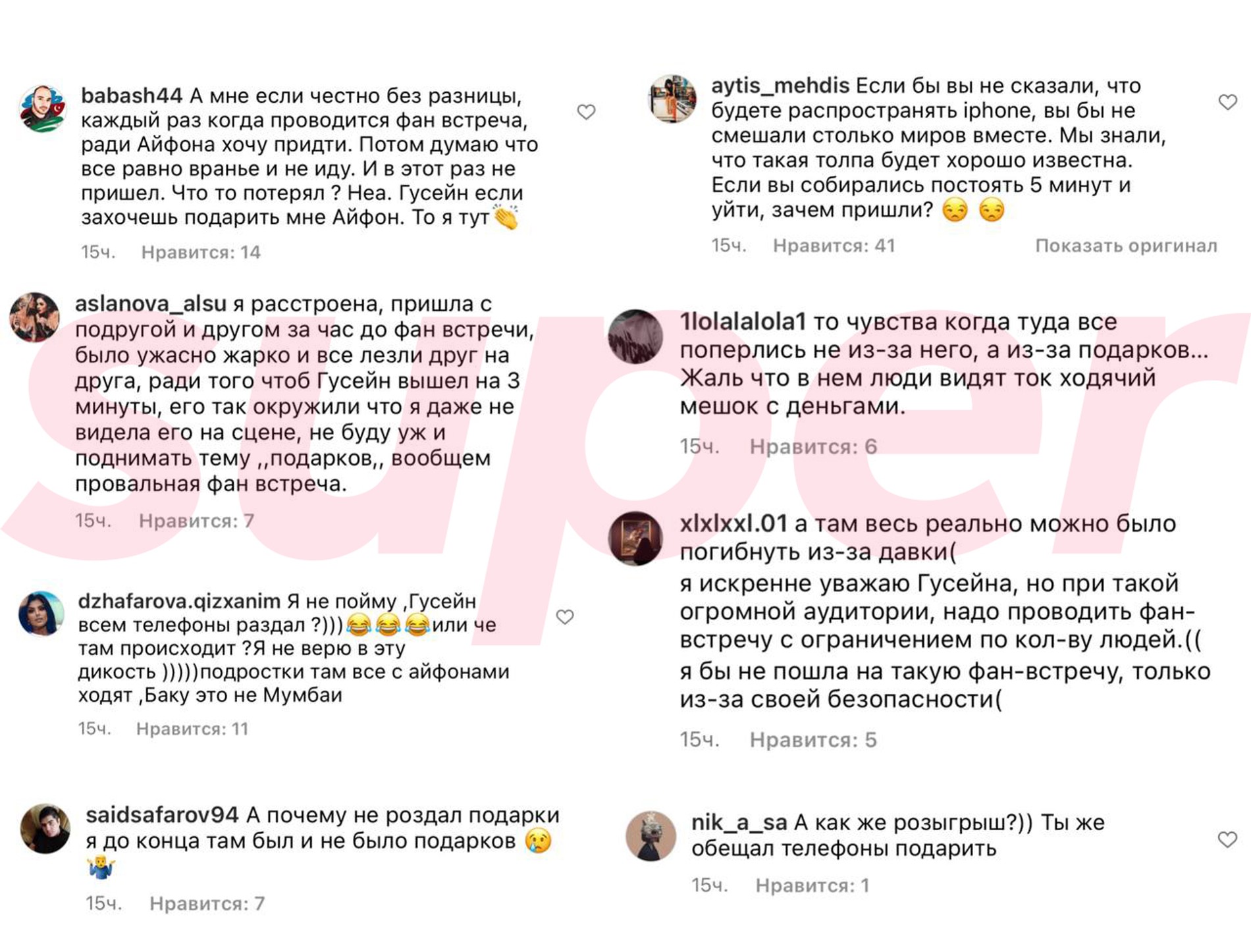 Многие жители Баку в шоке от произошедшего. В комментариях пишут, что им стыдно за своих соотечественников. Также граждане винят в произошедшем самого Гасанова, который не предусмотрел ограничения по количеству фанатов и заманил всех подарками. Судя по всему, телефоны кумир никому не раздавал.