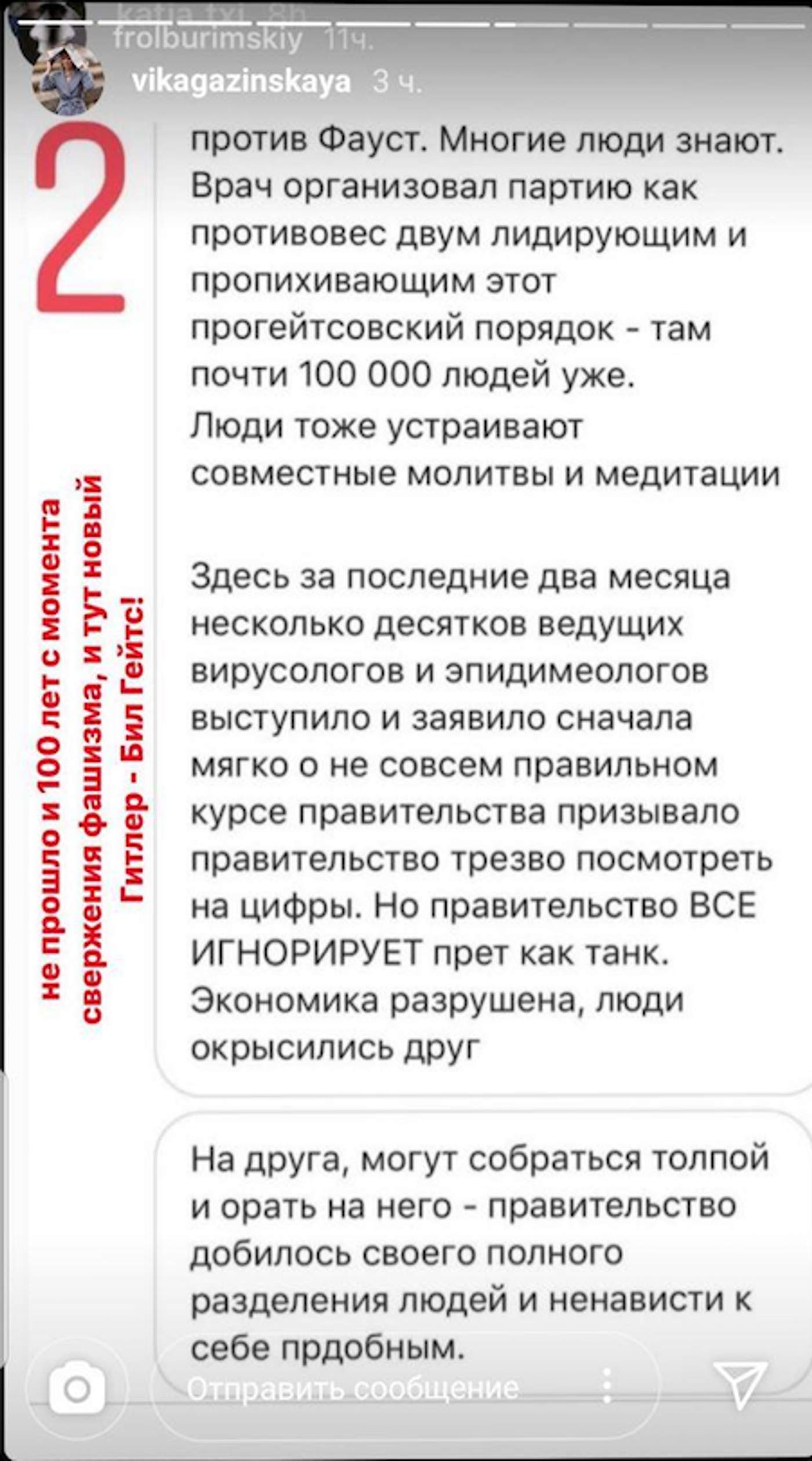 Итак, вот Вика Газинская — знаменитый столичный дизайнер, завсегдатай недель моды и «Симачева», пока он работал. Сначала модница постила в сториз опасения насчет того, что в нашу эпоху пришел «новый Гитлер — Билл Гейтс», а теперь называет «овощами» со своего второго аккаунта тех, кто в это не верит.