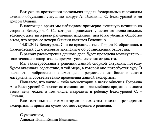 Также Головин через юриста высказал свое отношение к шумихе вокруг этой истории. По мнению актера, наблюдающего «повышенную активность со стороны матери Оливии в виде походов по телешоу», сторонам следует воздержаться от всех дальнейших комментариев, так как это «может навредить ребенку». Александр и его юрист предлагают всем дождаться результатов экспертизы ДНК, а потом продолжить разбирательство.
