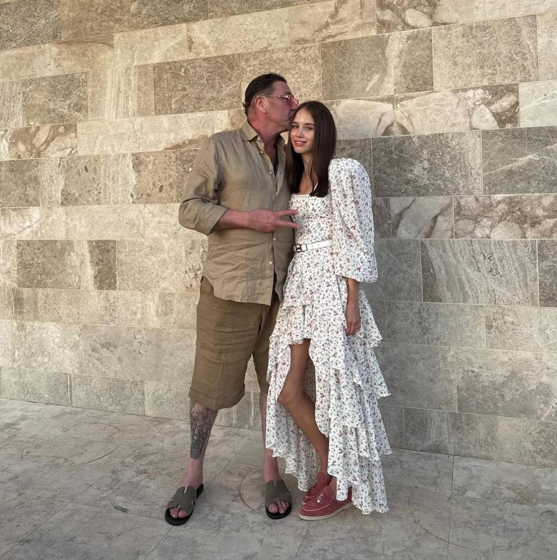 На опубликованных снимках 63-летний певец в расслабленном летнем образе: хлопковая рубашка, шорты цвета хаки и его фирменные очки. Его спутница, 19-летняя Аврора, позирует в белом шифоновом платье в цветочек. Особое внимание привлек кадр, где Лепс нежно целует девушку в затылок.