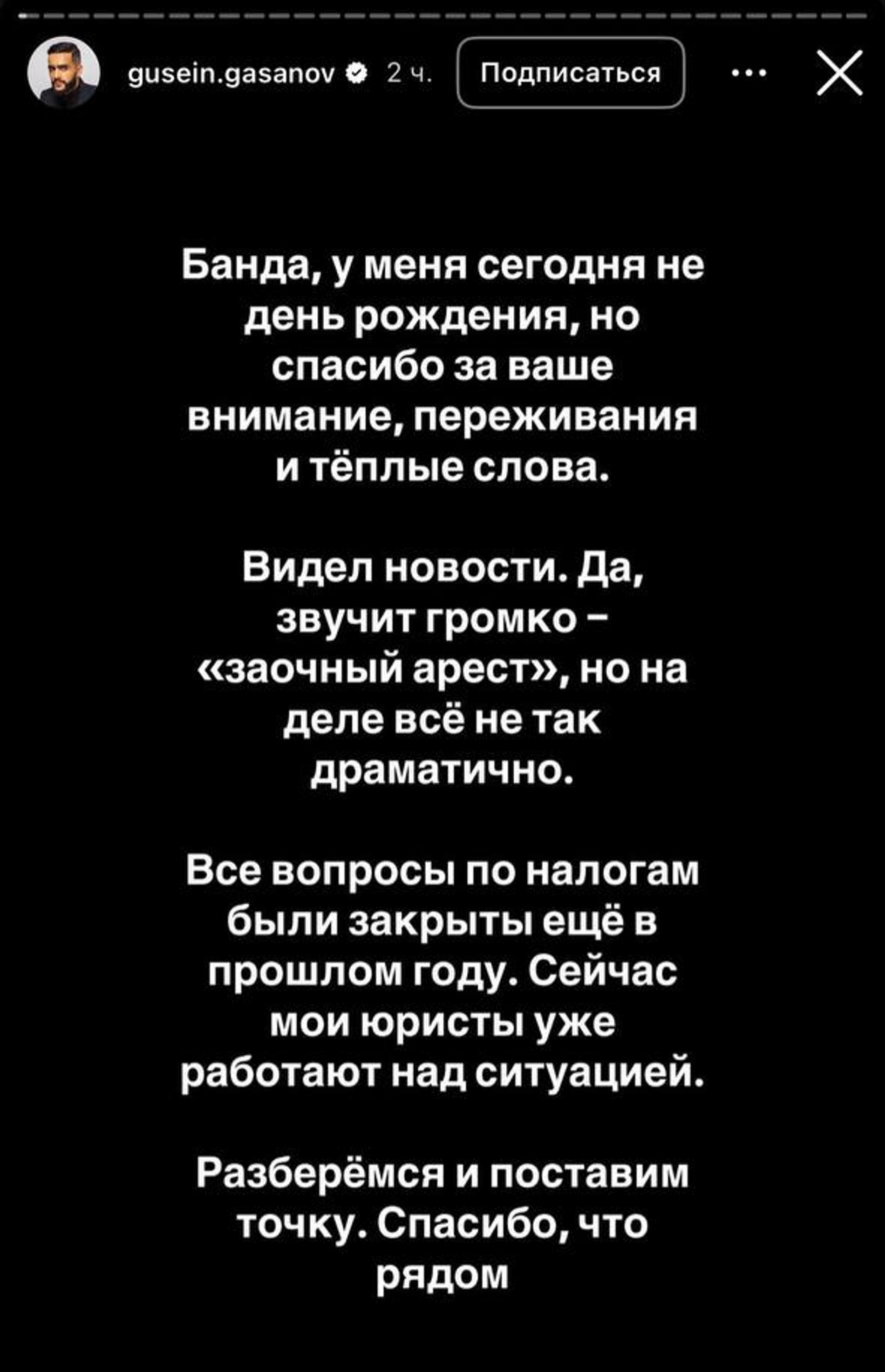 Гасанов уверен, что все «вопросы» по налогам были закрыты в прошлом году. По словам блогера, его юристы уже работают над сложившейся ситуацией, чтобы поставить в ней точку. В сентябре Гусейн действительно погасил гигантский долг перед налоговой, но, вероятно, к нему возникли новые претензии.