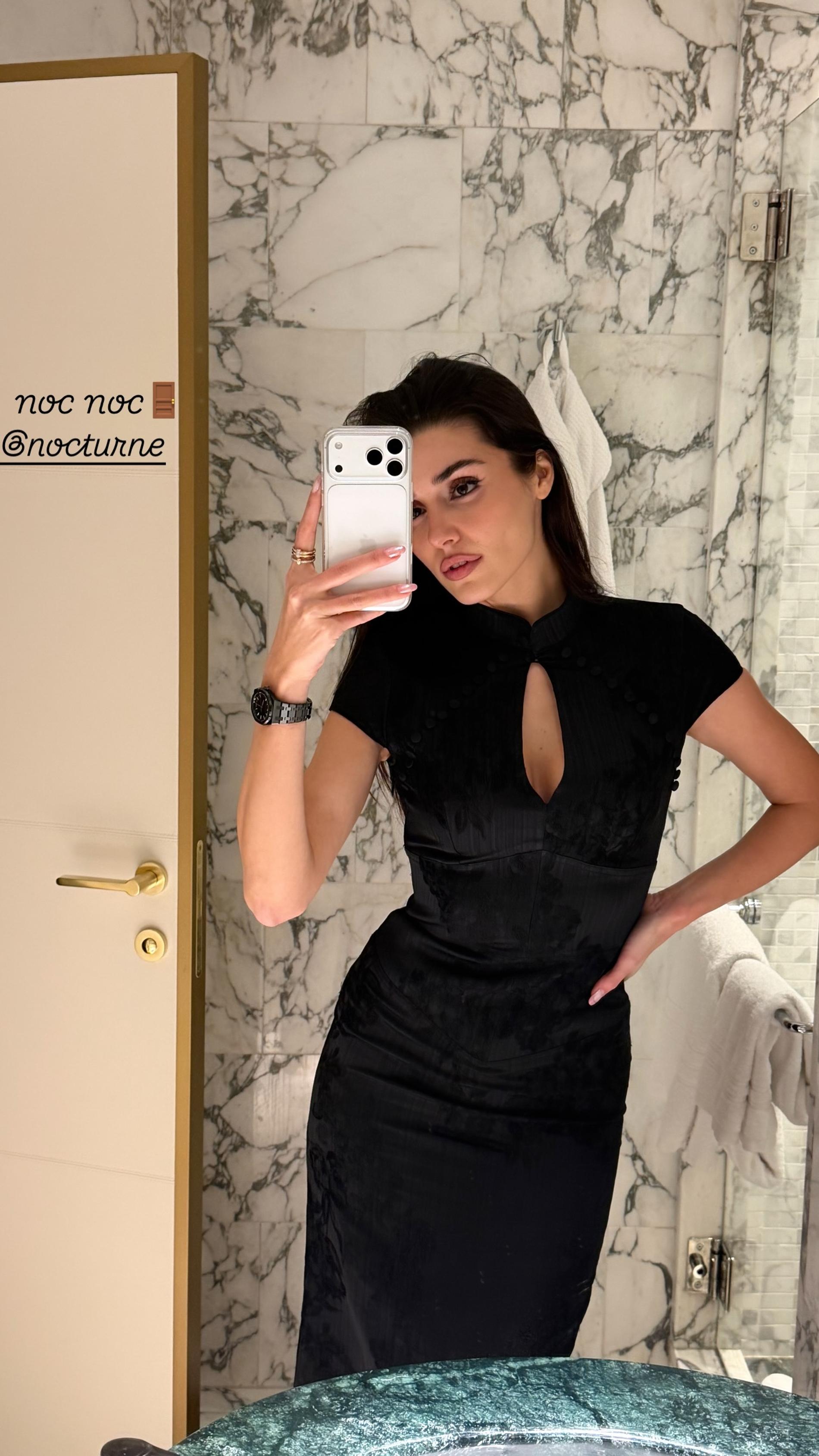 Образ дополнили лаконичные часы и золотые украшения, а волосы Эрчел выпрямила и уложила в гладкую прическу. Вечерний макияж подчеркнул черты лица, а атмосферная съемка прошла в ванной одного из отелей Милана. Интерьер с мягким светом и зеркалами добавил кадрам кинематографичности.
