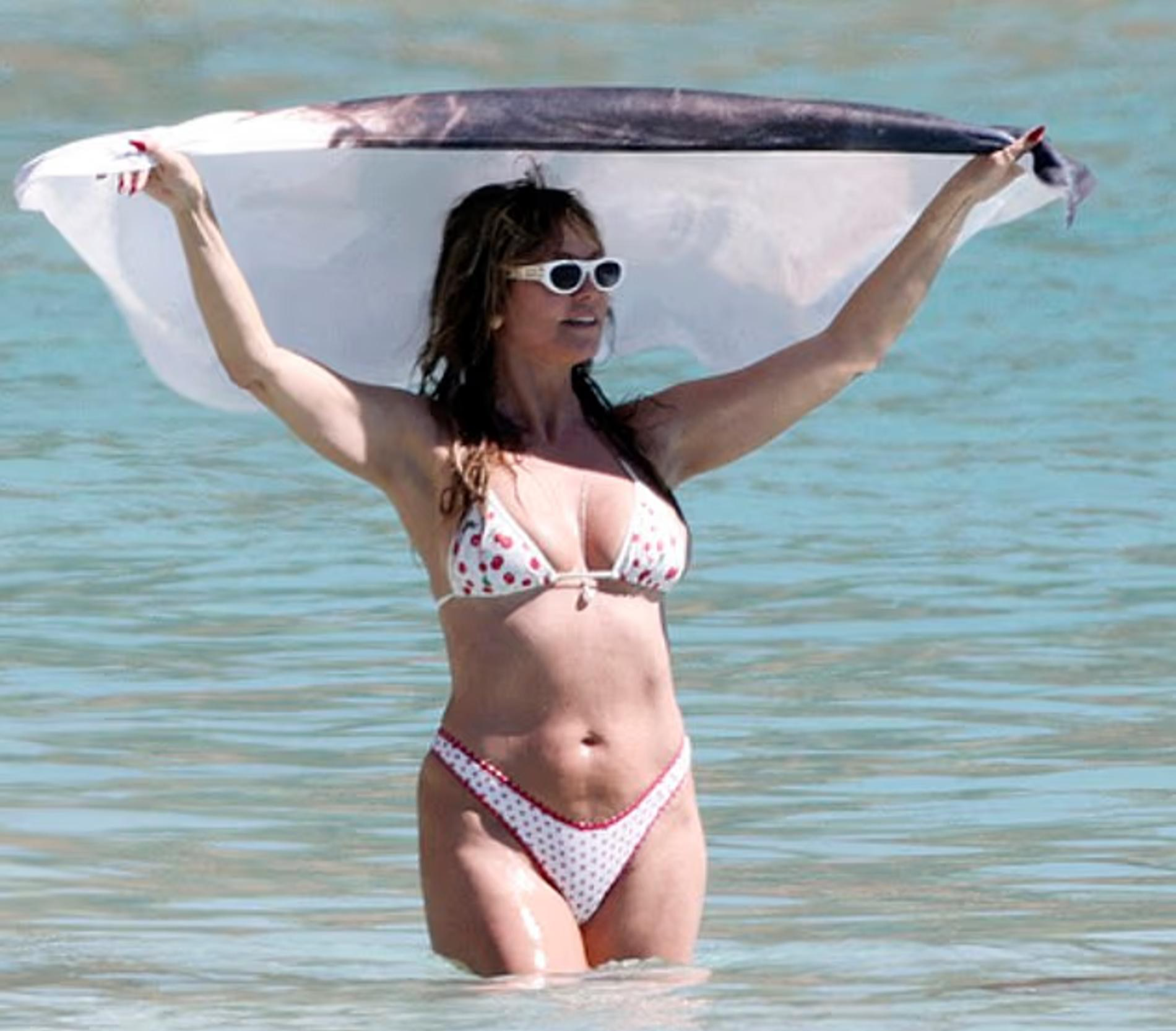 Папарацци засняли Хайди Клум на пляже с полотенцем, на котором было распечатано лицо её молодого мужа — Тома Каулитца. 52-летняя супермодель продемонстрировала эффектную фигуру в облегающем купальнике бикини с вишнёвым принтом, резвясь в воде с 36-летним рокером.