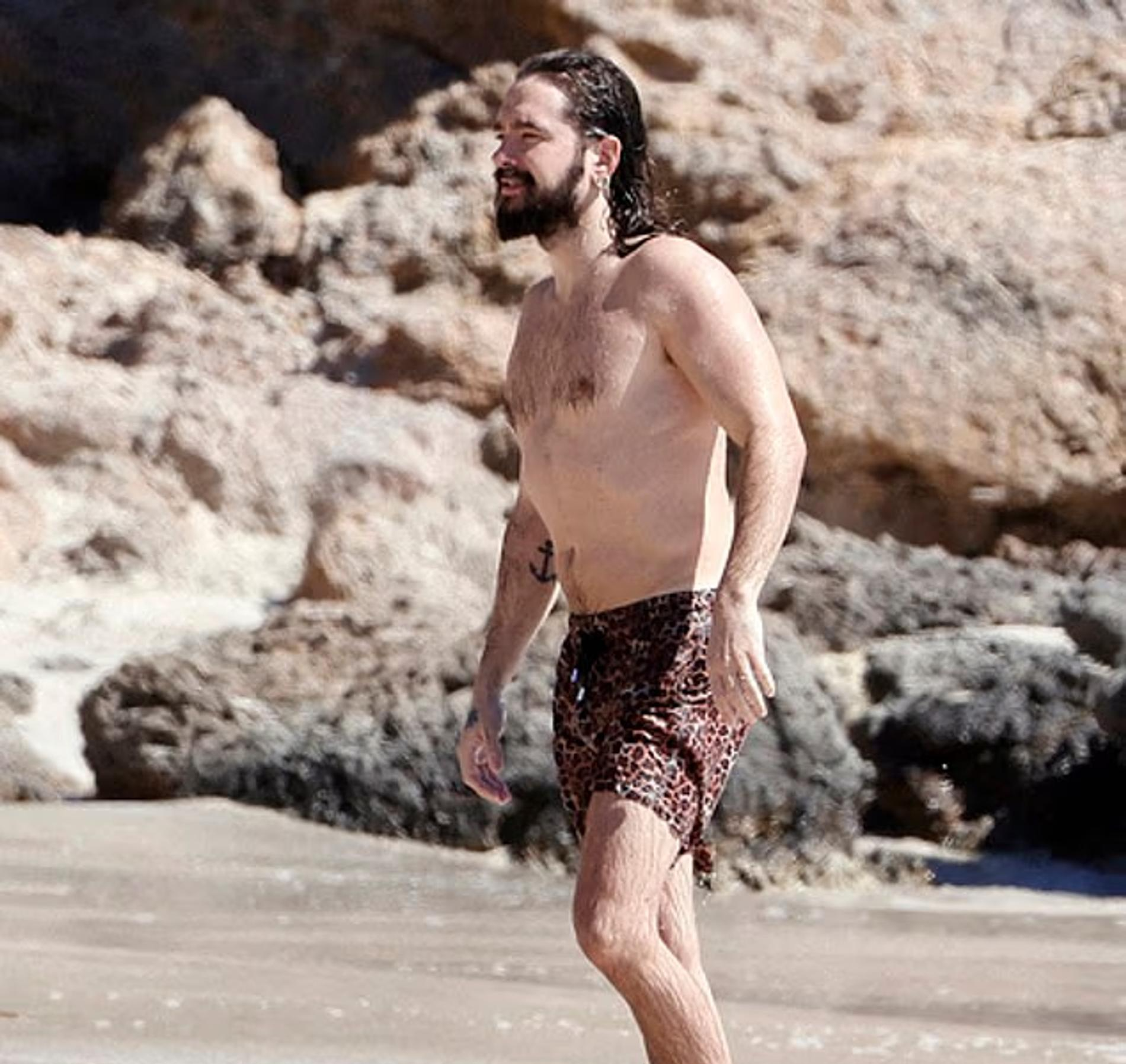 Каулитц также продемонстрировал папарацци покрытое татуировками тело, загорая в леопардовых плавках.
