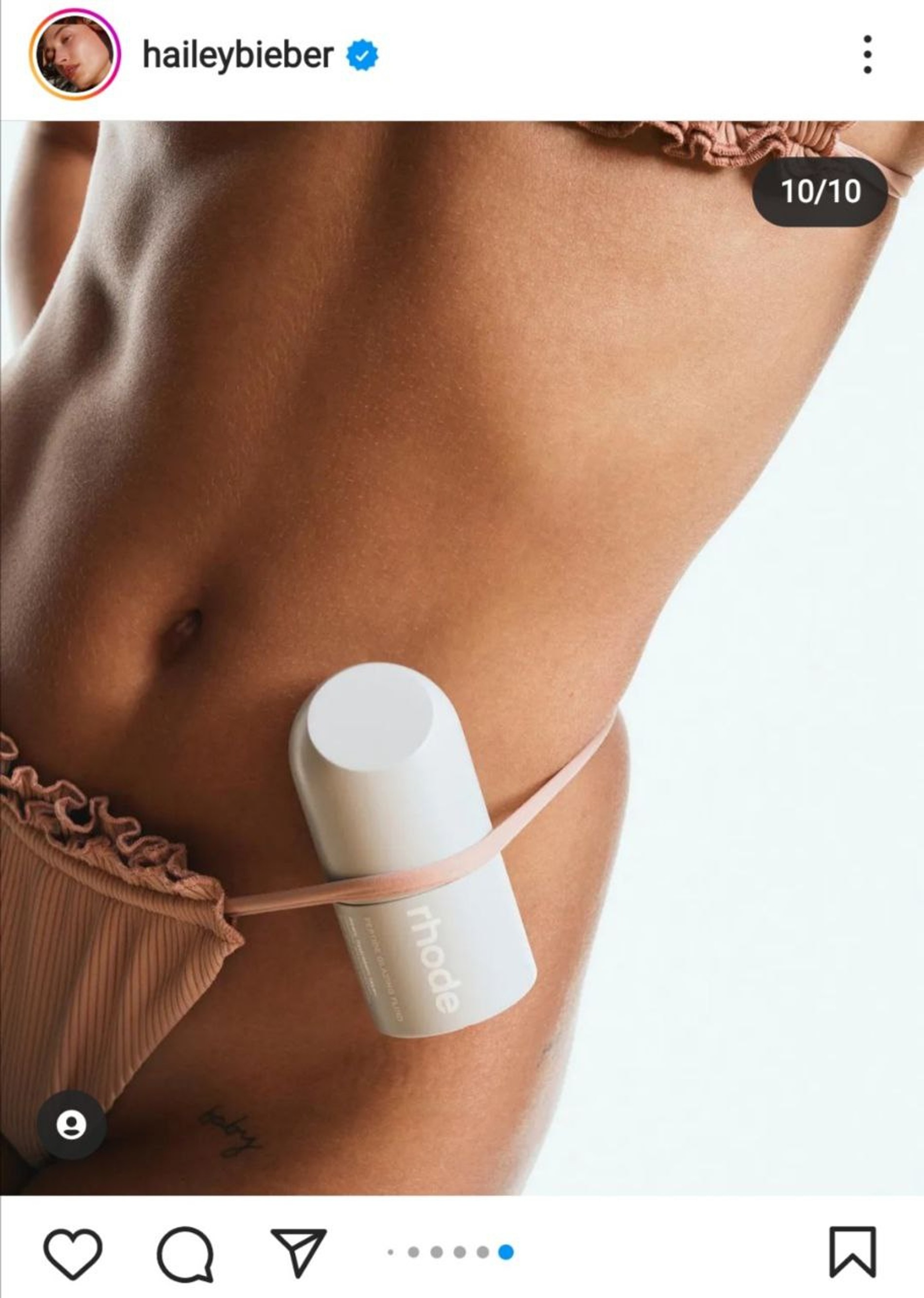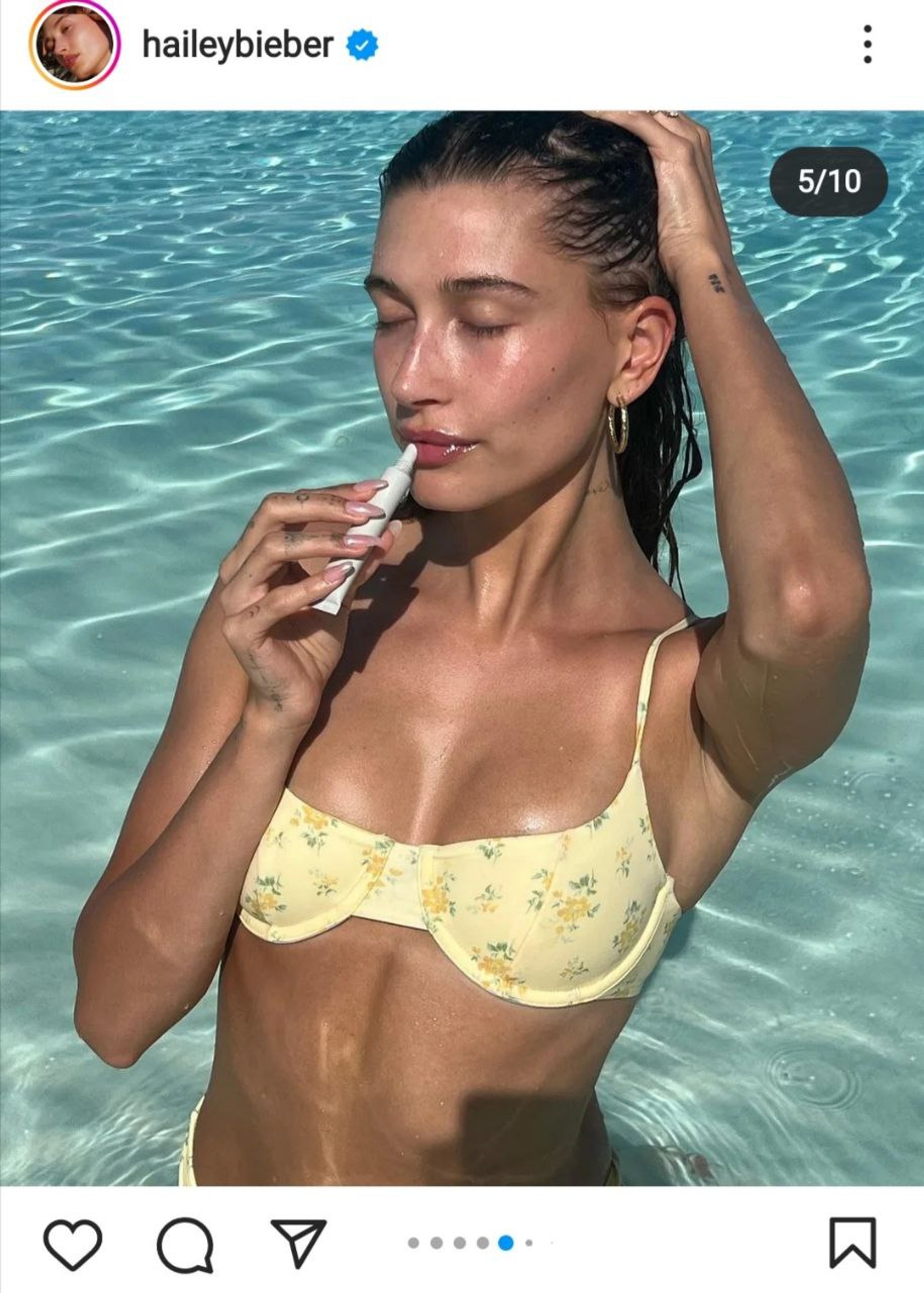 Так, на свежих фото в своем Инстаграме (запрещен в РФ) модель позирует на пляже в разных купальниках (наш фаворит — бледно-желтый с цветочным принтом) и с заветными баночками с надписью Rhode в руках (и не только в них). Неизменна лишь крохотная тату baby в зоне бикини. Надеемся, все старания Хейли окупятся.