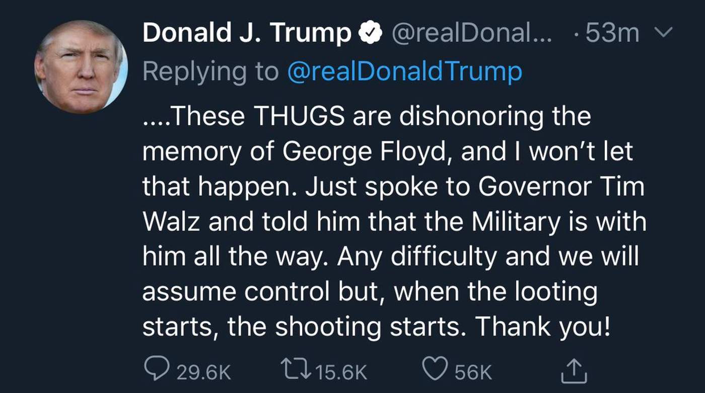 «Эти бандиты очерняют память Джорджа Флойда, я этого не допущу. Я сказал губернатору, что вооруженные силы его поддержат. Когда начинается разбой, начинается и стрельба»