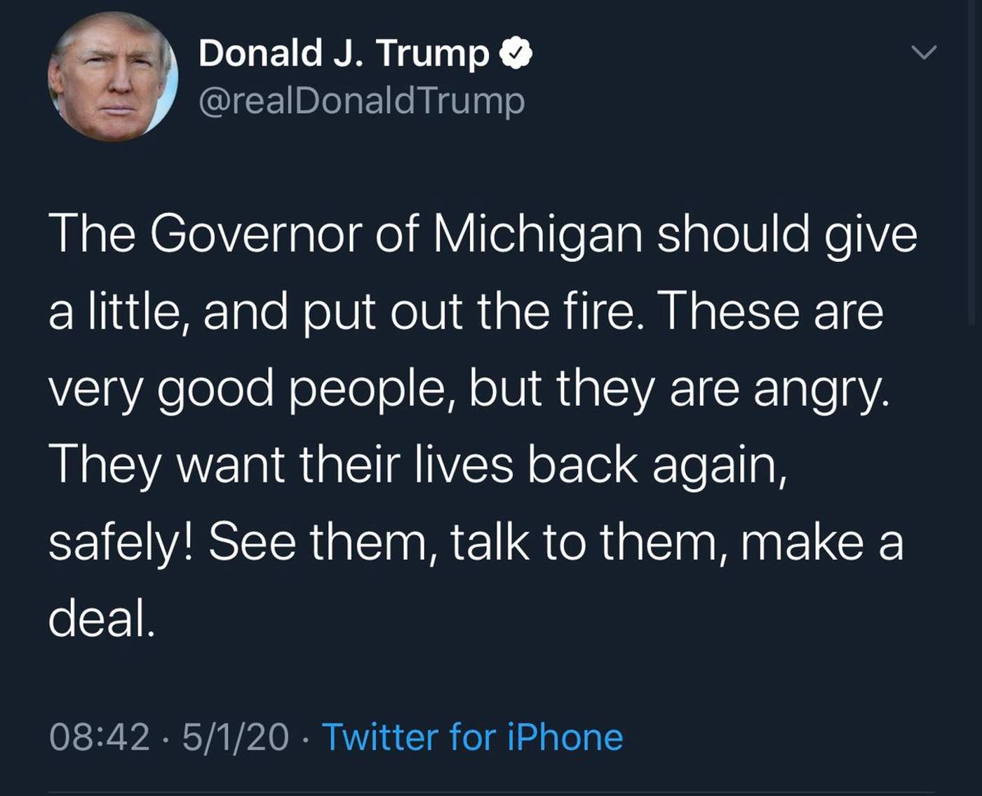 «Губернатору Мичигана стоит немного отступить и всех успокоить. Они очень хорошие люди, но они в ярости. Они хотят вернуть свои жизни! Выйдите к ним, все обсудите и договоритесь »