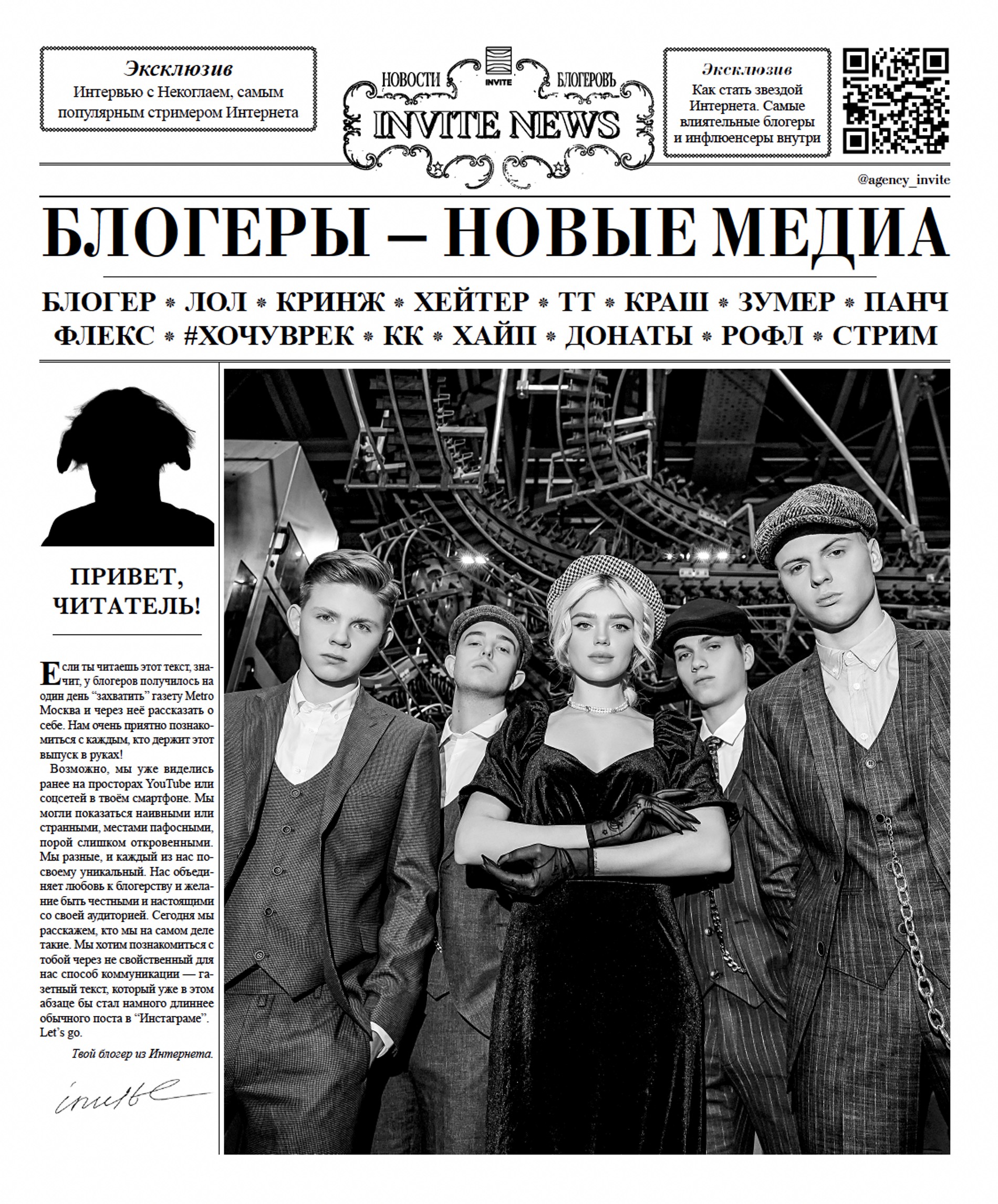 «Блогеры — новые медиа». Именно под таким слоганом прошла закрытая презентация креативного центра INVITE Agency. В столичном Noor Bar агентство представило публике своих восходящих звезд: Никиту Левинского, Сашу Новикова, Леру Изумруд, Макса Климтока и других. INVITE подписывает эксклюзивные контракты с талантливыми ребятами, которые стремительно набирают популярность в Сети.