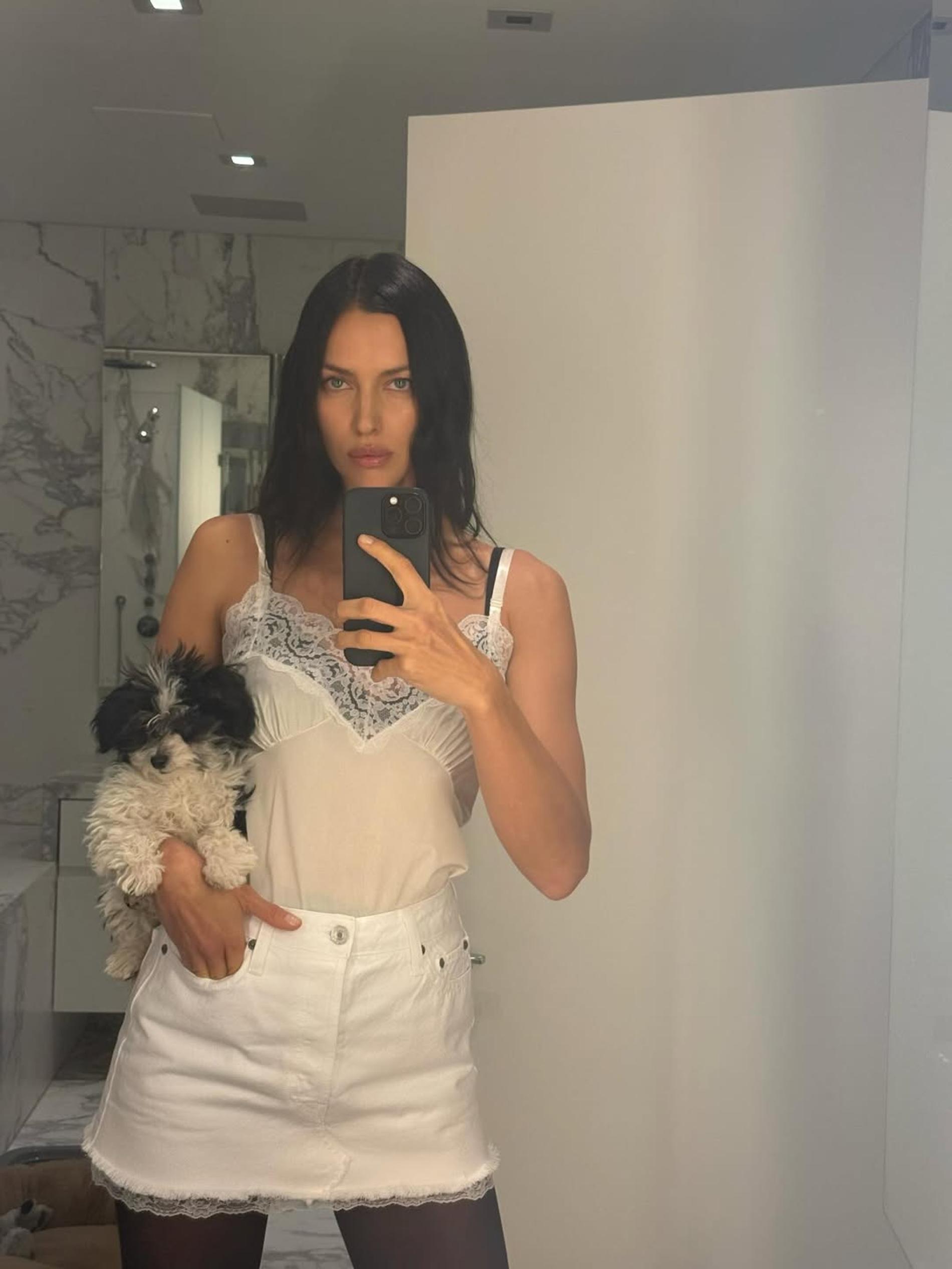 Звезда мировых подиумов Ирина Шейк поделилась с подписчиками серией новых снимков, представив своего нового питомца — черно-белого щенка породы гавайский бишон.
