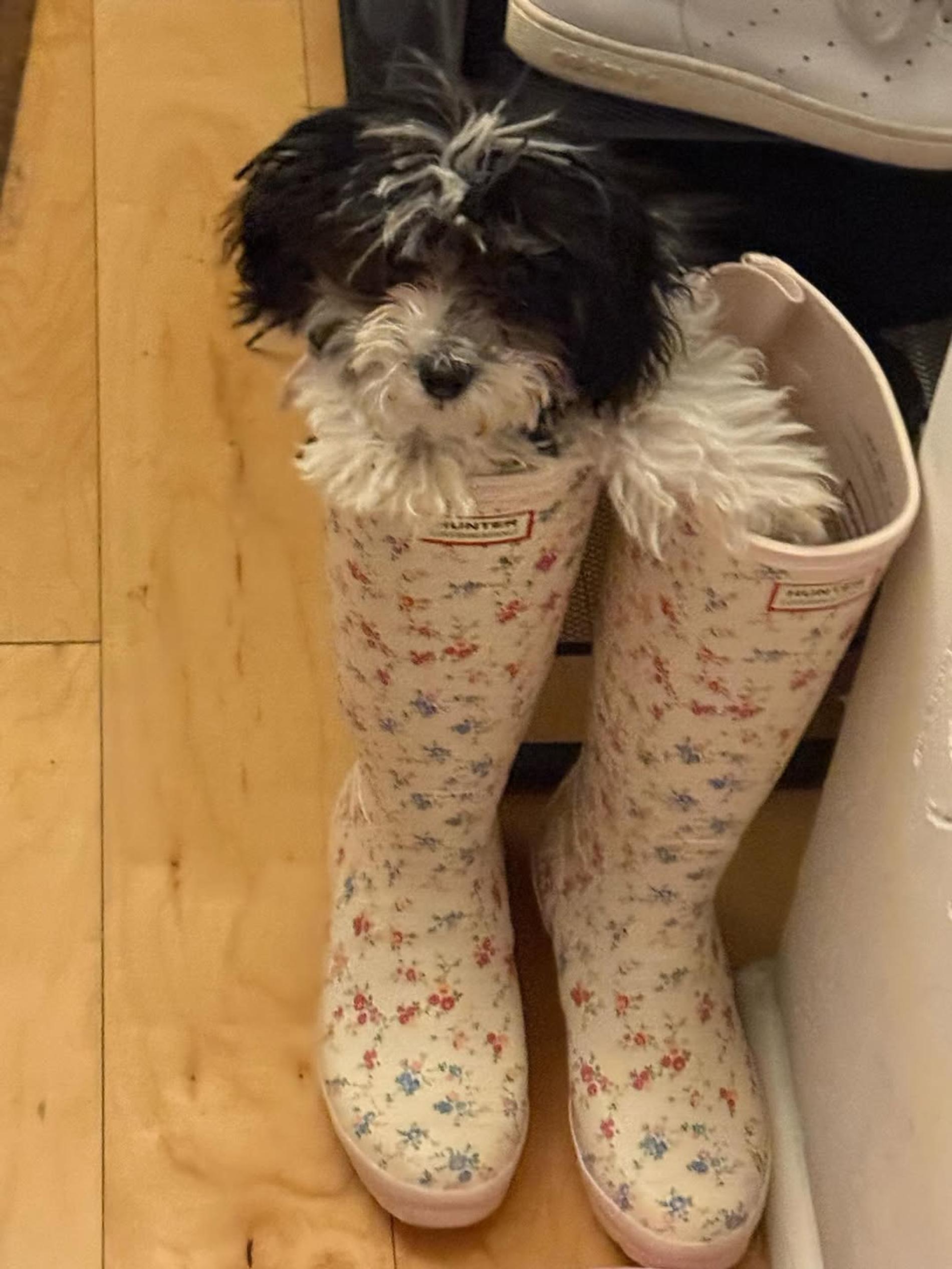Модель, которую часто называют музой Риккардо Тиши, показала щенка дома: малыш быстро освоился в новом пространстве и уже начал проявлять характер. На одном из кадров щенок даже забрался в сапоги хозяйки, устроив небольшую «проверку территории».