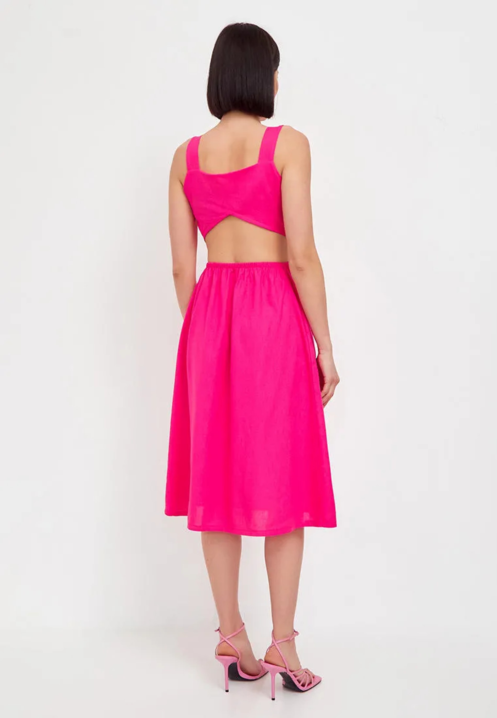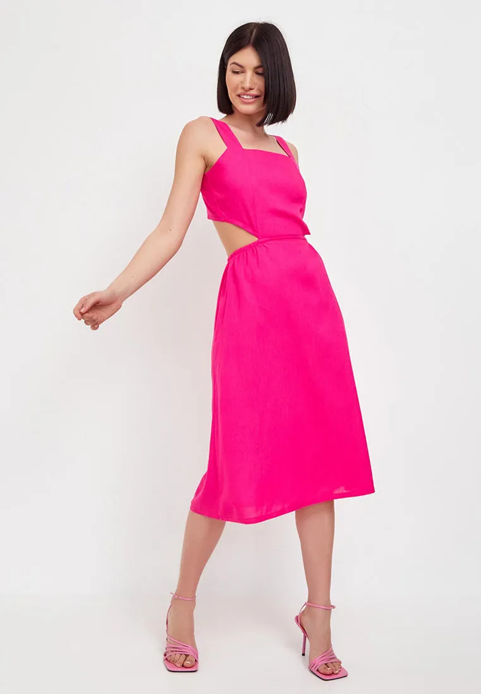Барби-стиль нынче в моде, так что и у этого фукси-сарафана с геометрическими вырезами на талии есть все шансы надолго задержаться в гардеробе.