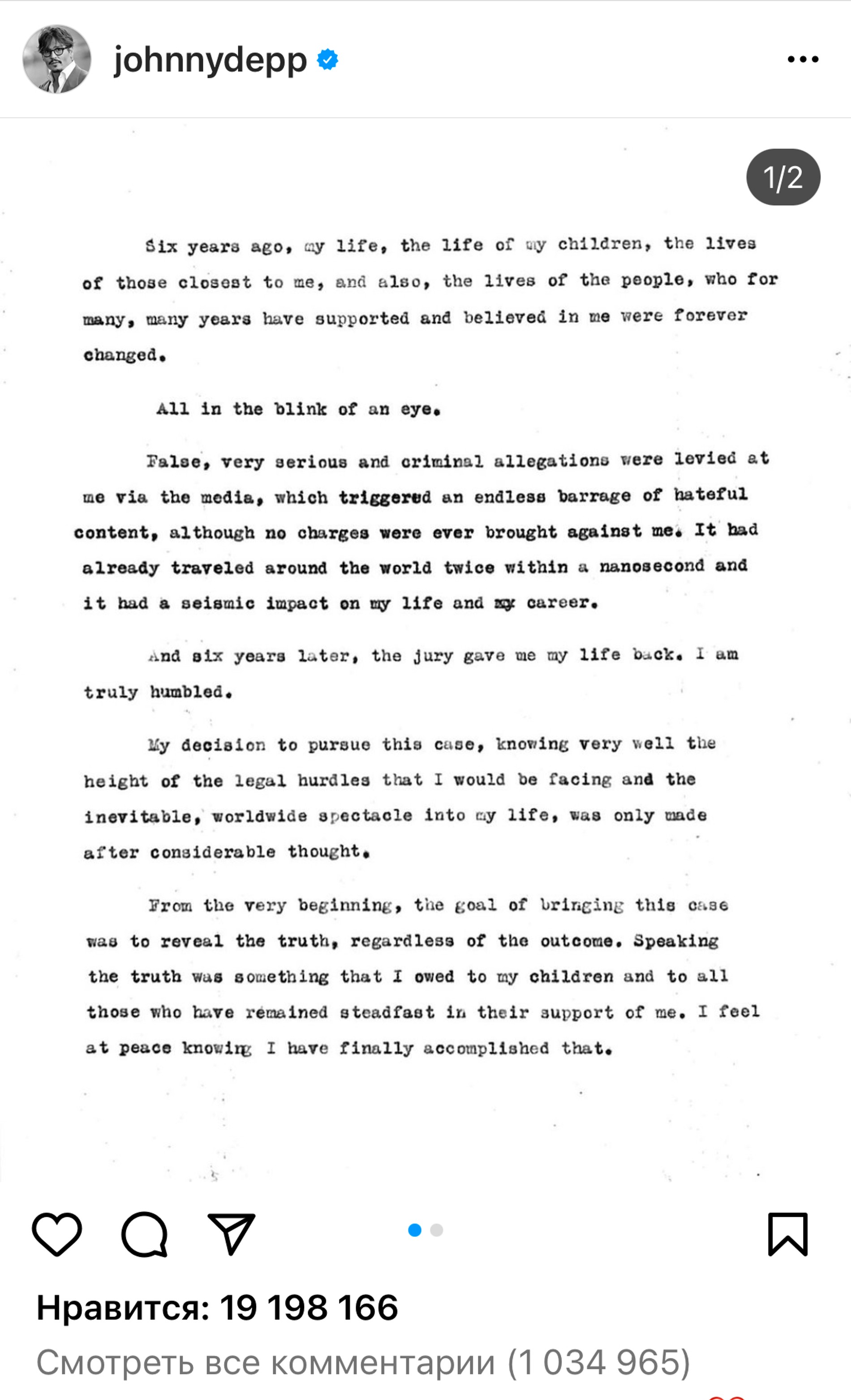 Пост благодарности Джонни Деппа поклонникам после суда попал в топ самых популярных публикаций в Инстаграме*