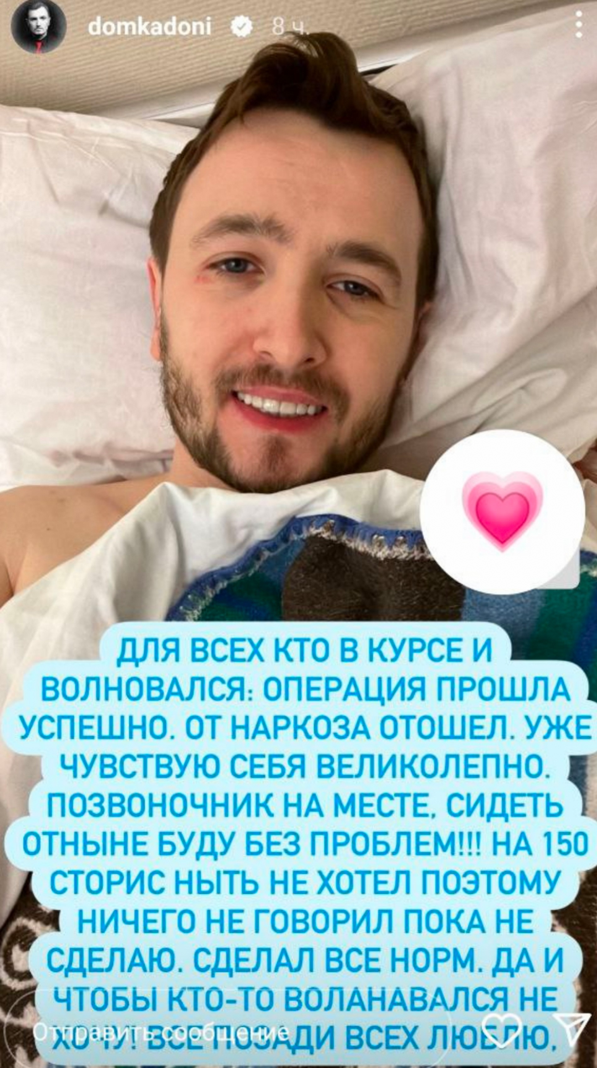 Предвосхищая вопросы подписчиков из серии «почему скрывал», Кадони заявил, что не желал лишний раз жаловаться и заставлять всех вокруг беспокоиться. «На 150 сторис ныть не хотел, поэтому ничего не говорил, пока не сделаю. Сделал, все норм. Да и не хочу, чтобы кто-то волновался! Все позади, всех люблю», — написал телеведущий. Что же, поздравляем и желаем скорейшего восстановления.