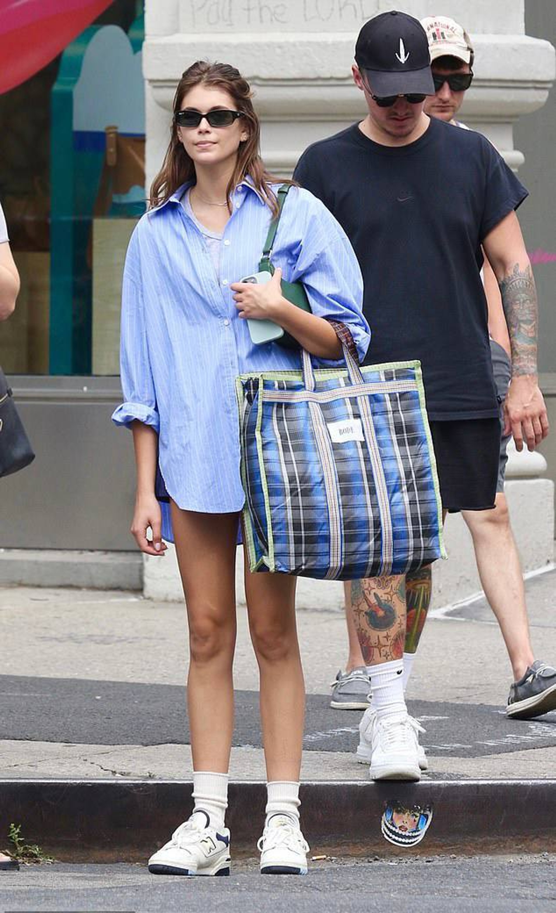 От красавицы Кайи Гербер, дочери супермодели Синди Кроуфорд и бизнесмена Рэнди Гербера, громких поводов посудачить не дождешься: ни романов с рэперами, ни топлес-луков, ни провокационных заявлений. Мол, скукотища да и только, впору жаловаться папарацци. Ну а мы бы сказали: красота, интеллигентность, обаяние, да и только. Посмотрите, как муза Дома Chanel и главная звезда десятка модных показов ходит на шопинг в Нью-Йорке: плиссированная юбка в духе школьной формы, простенькая серая футболка, голубая рубашка в полоску и... А это что такое? Сумка челнок-стайл! Прелесть какая. Ну зато, как говорится, все в тон. Нет-нет, мы вовсе не злорадствуем — мы Кайю нежно любим и всегда любуемся.