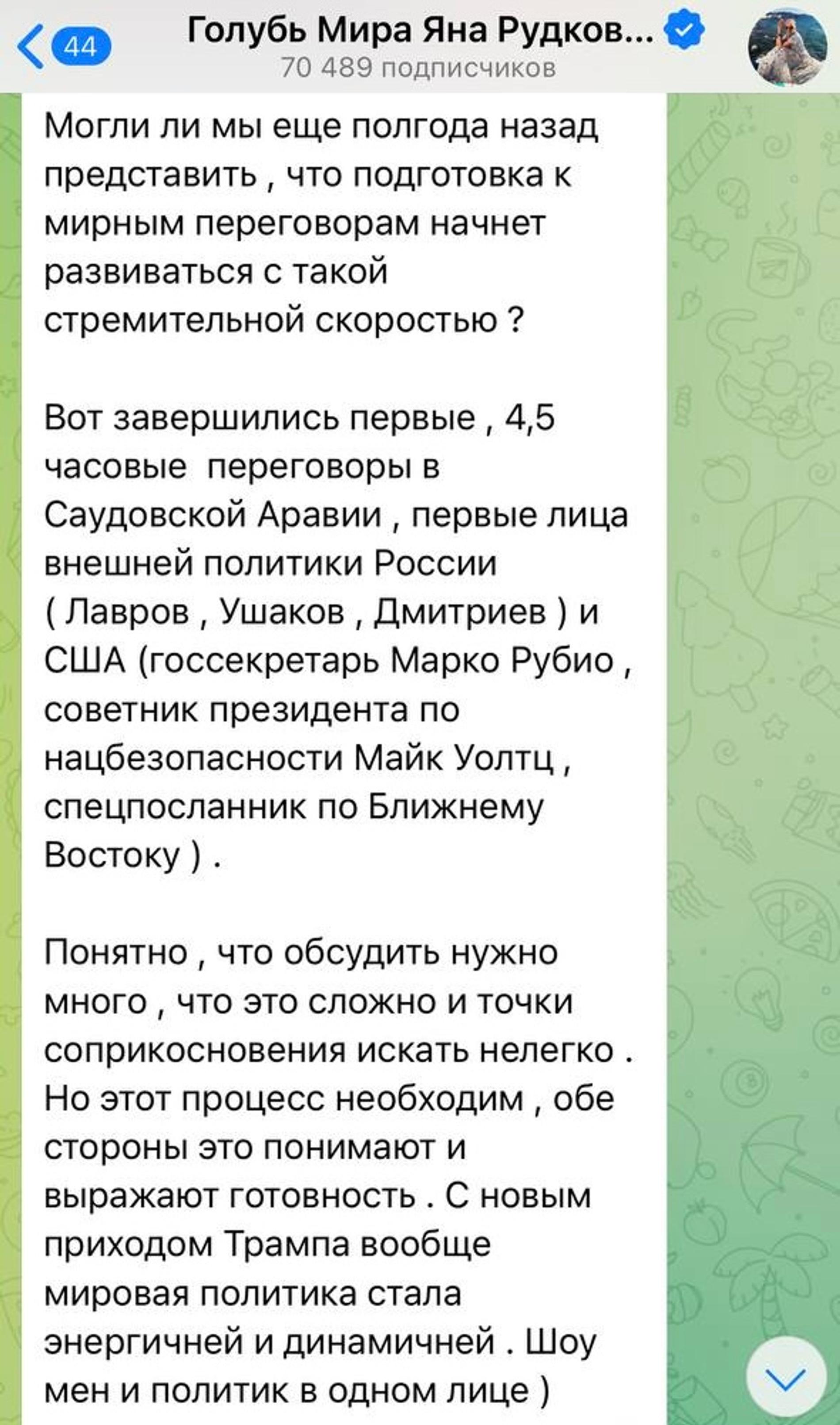 Мы пришельцам верим: когда они нас обманывали? Однако пока что пророчество не сбылось. Где брать голые факты и сухую аналитику? Ответ прост: из телеграм-каналов Яны Рудковской и Леры Кудрявцевой. Матроны шоу-бизнеса держат подписчиков в курсе всех обновлений по политической обстановке и деталям дипломатического общения. «Понятно, что обсудить нужно много, что это сложно и точки соприкосновения искать нелегко. Но этот процесс необходим, обе стороны это понимают и выражают готовность», — анализирует раунд в Эр-Рияде Рудковская. И попутно надеется на то, что Дональд Трамп оживит тонущую в бюрократизме мировую политику: «Шоумен и политик в одном лице».