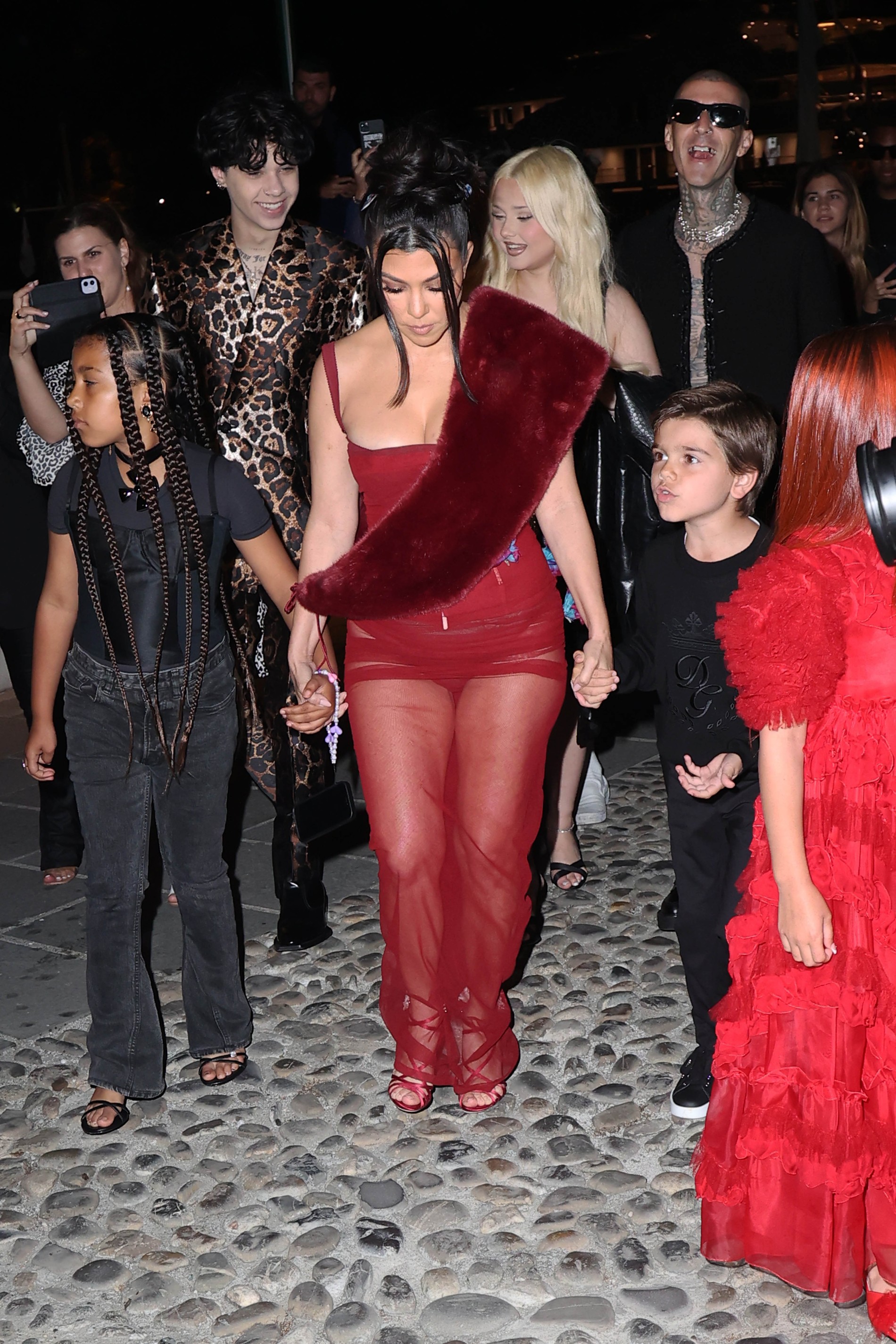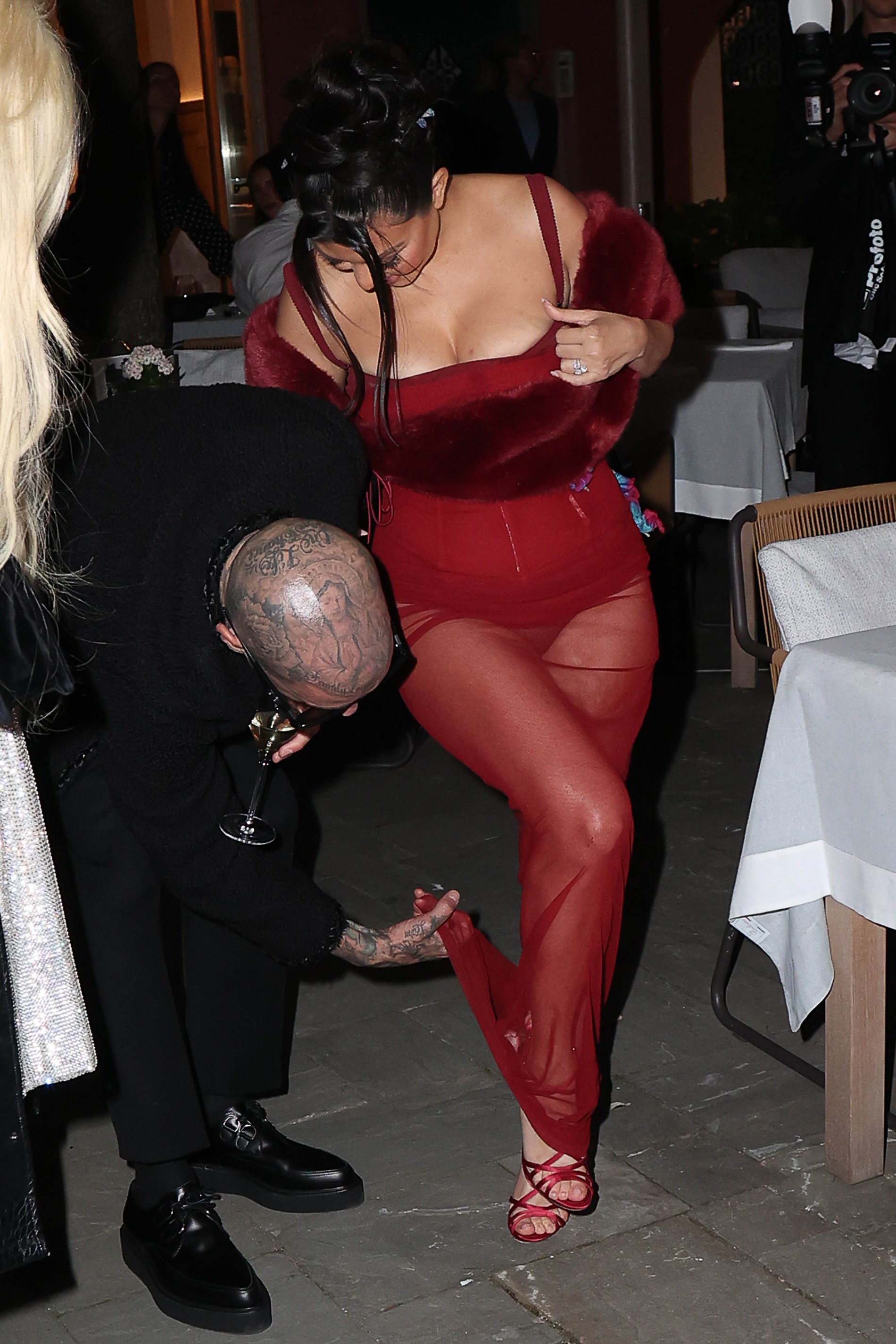 Кортни надела красное боди с прозрачным верхом, дополнив образ палантином из искусственного меха. Трэвис Баркер появился на предсвадебной вечеринке в черном твидовом пиджаке.