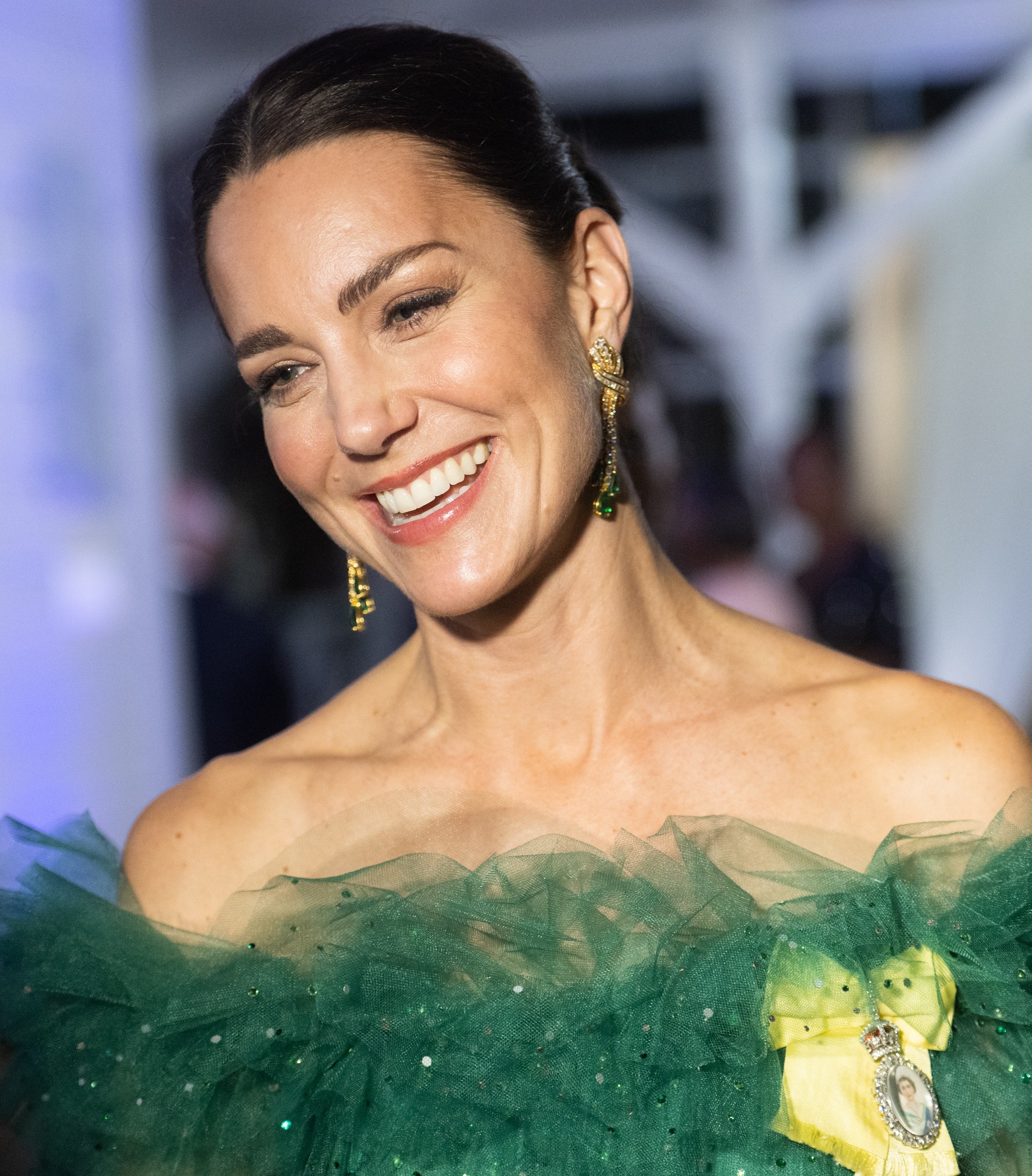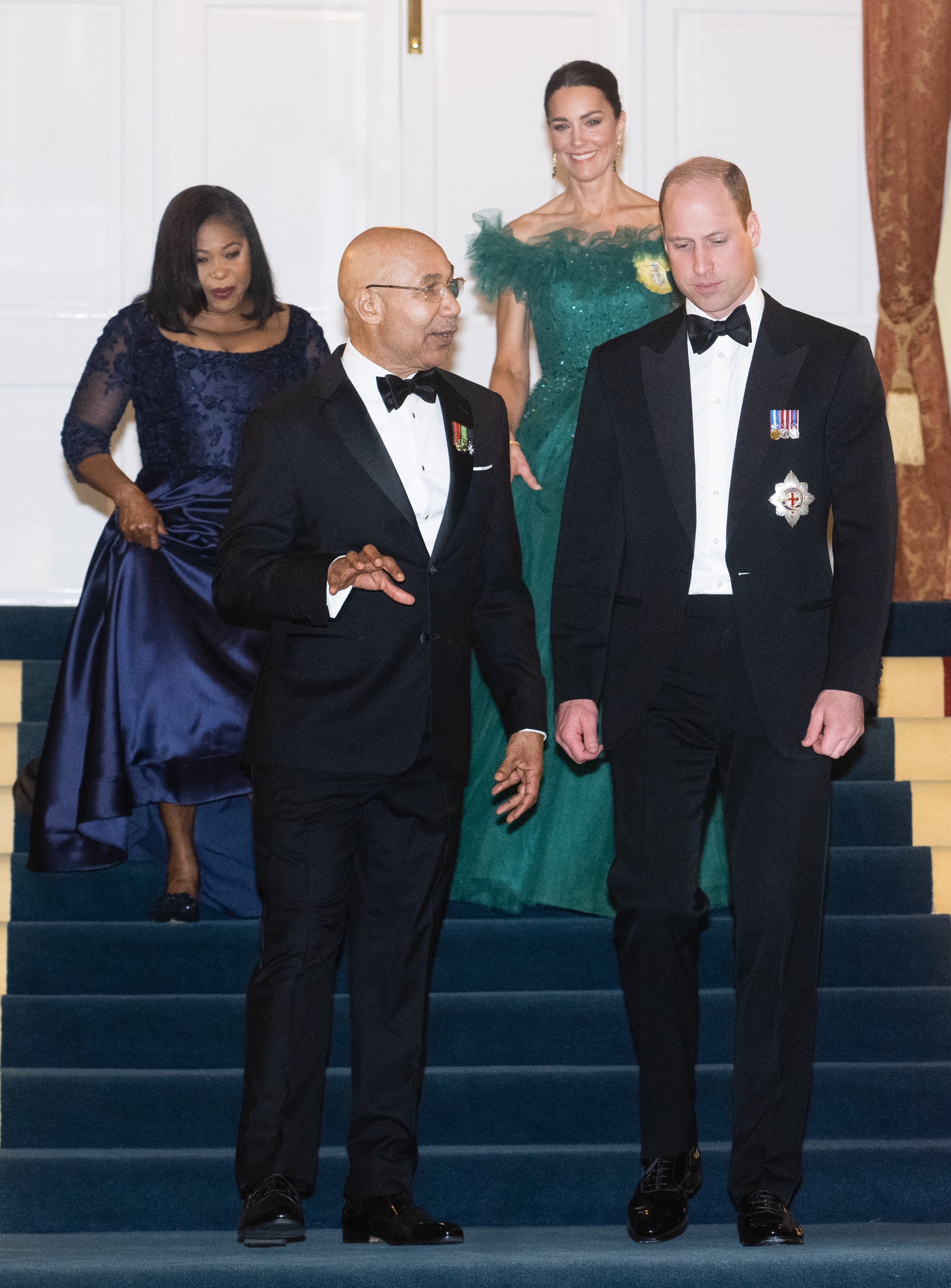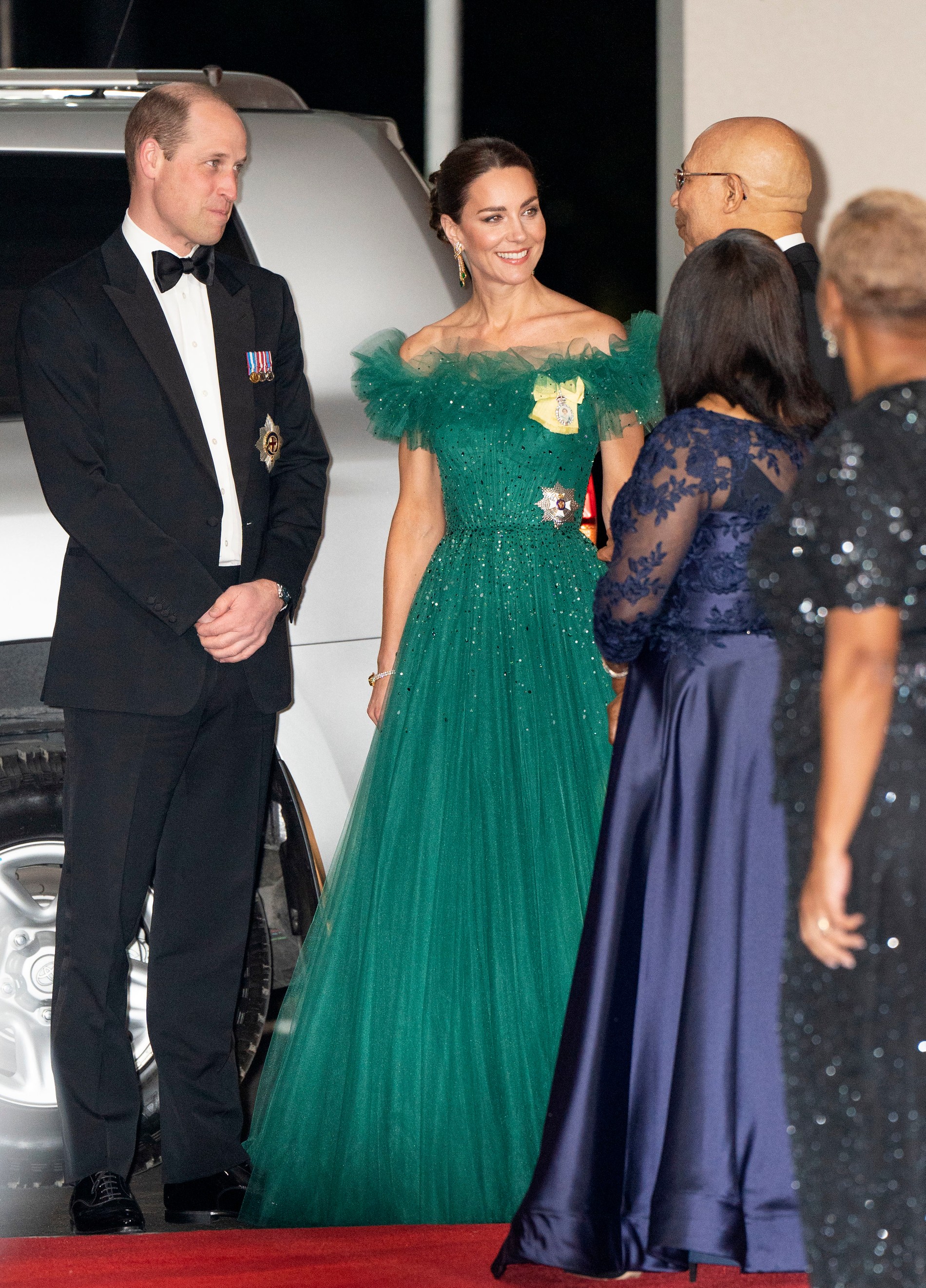 Кейт Миддлтон и принц Уильям путешествуют по странам Карибского бассейна в честь юбилея королевы Елизаветы II, ставшей первым британским монархом, правившим 70 лет. Вчера на официальном ужине в резиденции генерал-губернатора Ямайки в Кингстоне герцогиня появилась в блистательном платье в пол изумрудного оттенка. Подол платья украшали кристаллы, а зону декольте — два ордена: это королевский семейный орден и награда Большого креста Королевского Викторианского ордена.