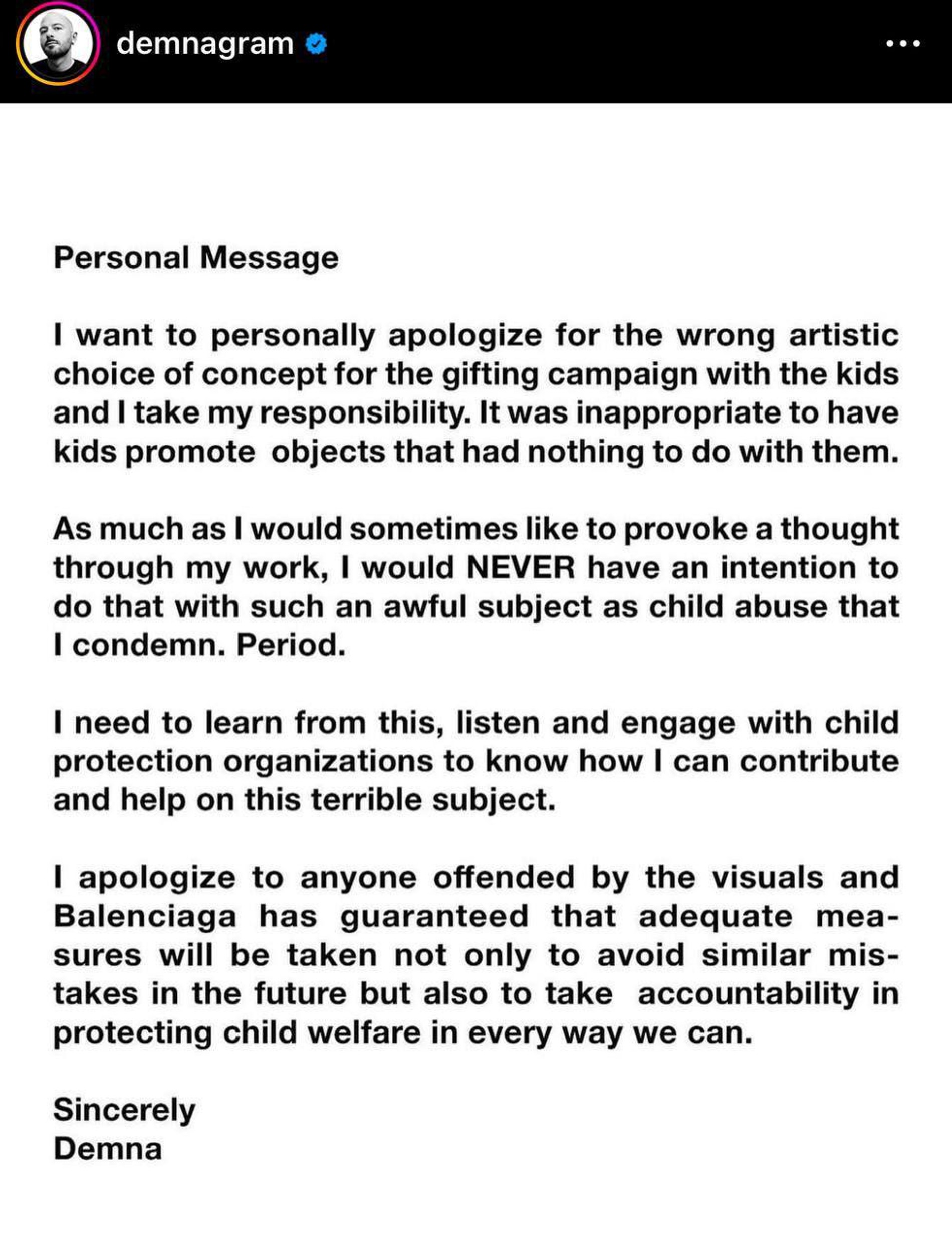 Кстати, креативный директор Balenciaga Демна Гвасалия вчера принес персональные извинения за ту самую рекламу. «Я хочу лично извиниться за неверный творческий выбор концепции съемки с детьми, ответственность за это я беру на себя, — написал дизайнер. — Было неприемлемо привлекать детей к демонстрации предметов, не имеющих к ним никакого отношения. Иногда я люблю провоцировать публику своими работами, но у меня никогда не было намерения связывать их с такой ужасной вещью, как жестокое обращение с детьми. Я такое осуждаю — и точка». Что ж, посмотрим, сможет ли Balenciaga вернуть былые позиции после такого покаяния, но уже без одного из своих главных амбассадоров.