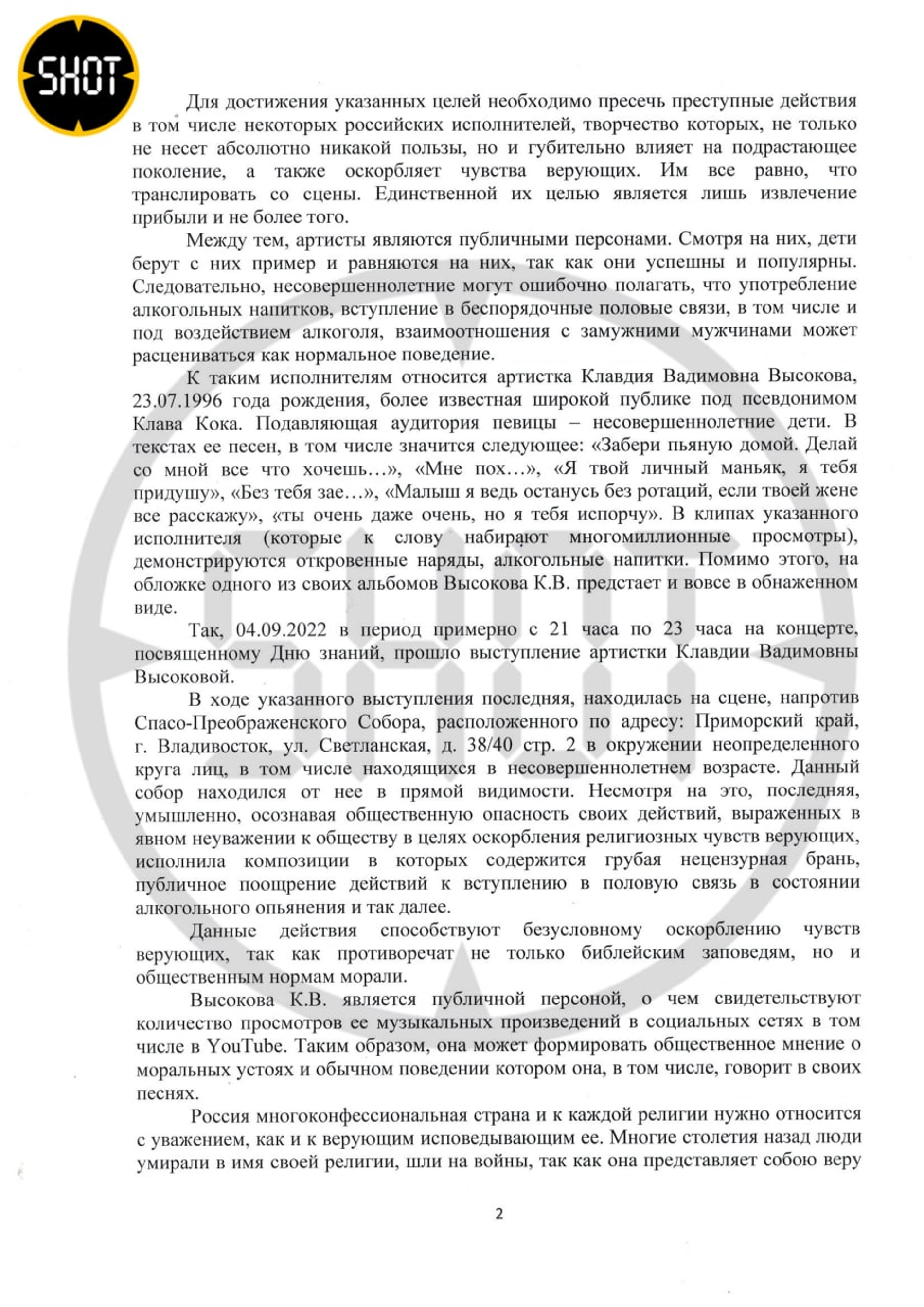 «Необходимо пресекать преступные действия, в том числе некоторых российских исполнителей, чье творчество не только не несет абсолютно никакой пользы, но и губительно влияет на подрастающее поколение, а также оскорбляет чувства верующих», — говорится в официальном обращении, которое приводит Telegram-канал Shot.