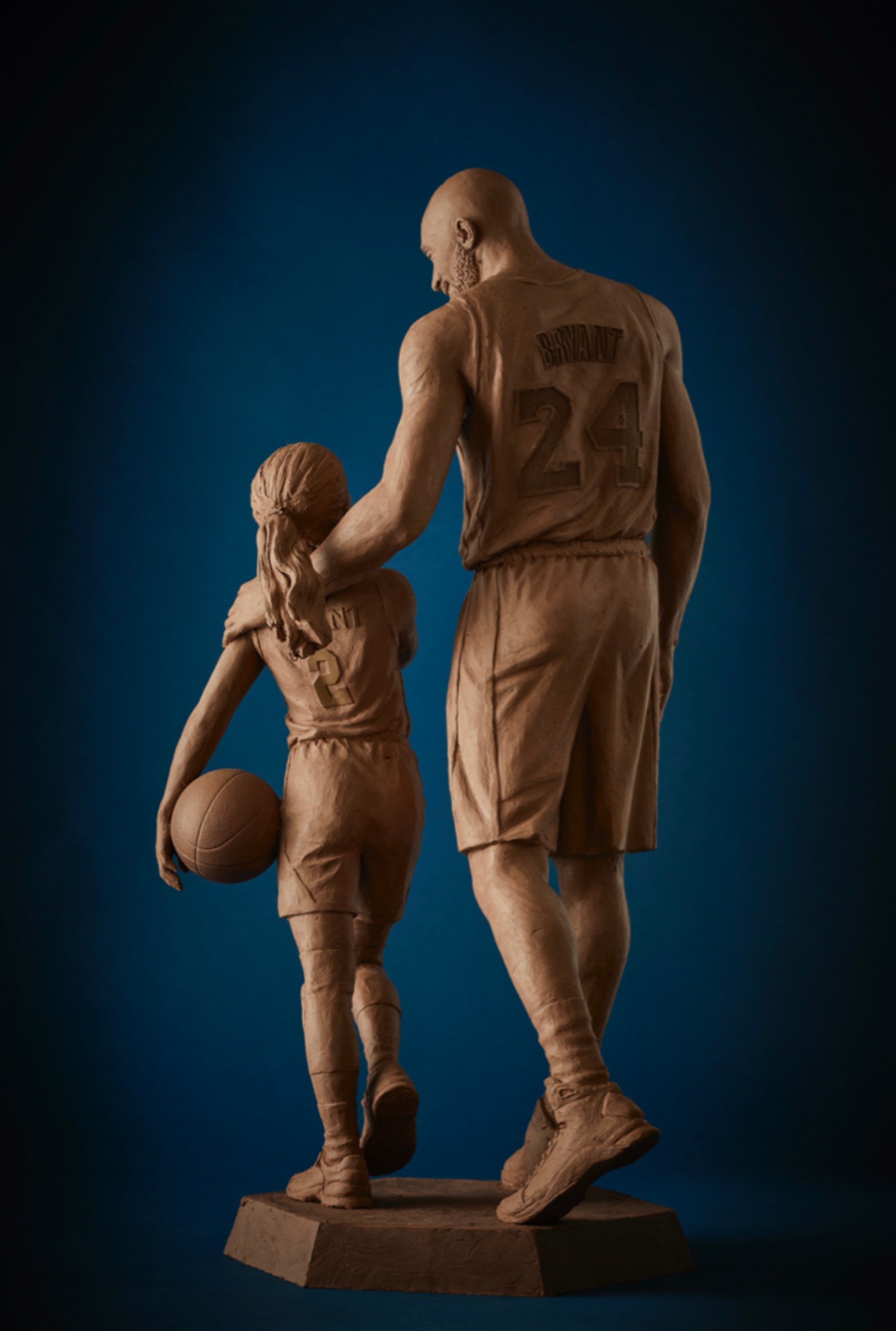 Брайанта изобразили в форме клуба «Лос-Анджелес Лейкерс», а его дочь Джианна держит баскетбольный мяч. Не забыл автор и о других жертвах крушения вертолета — на памятнике выгравированы имена и других погибших. Скульптура выполнена из бронзы.