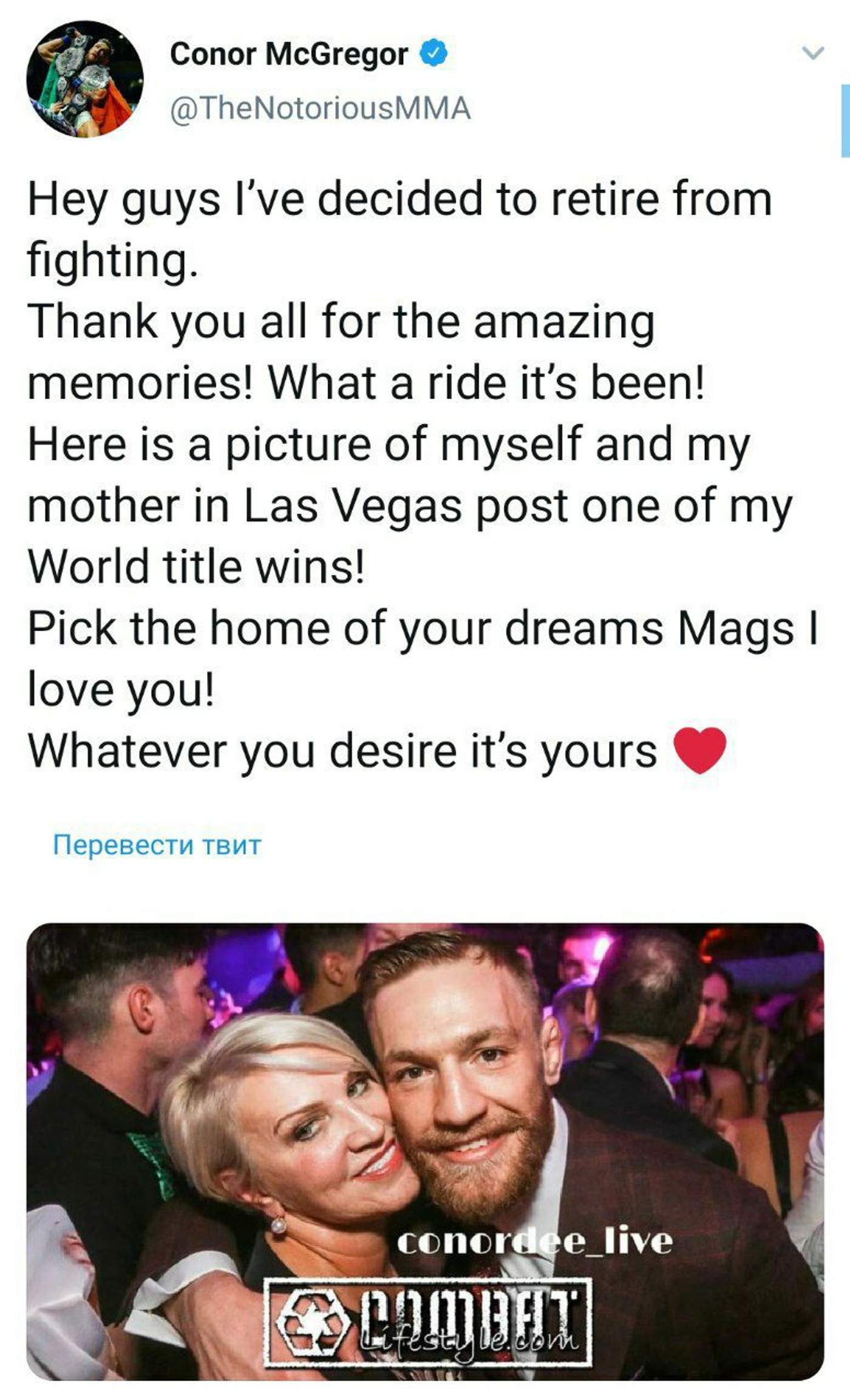 Также Конор, написавший прощальный пост с своем твиттере, поделился архивным фото со своей мамой.