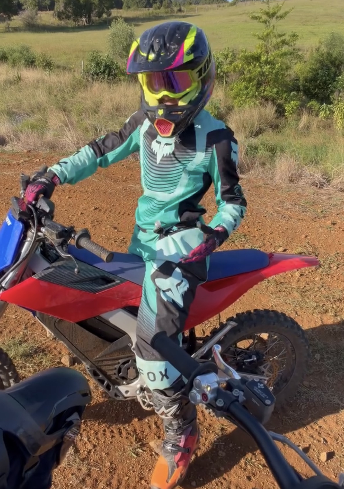 На видео наследница актёра Индия исполняет рискованный трюк: она подпрыгивает на мотоцикле над невысокой песчаной насыпью.