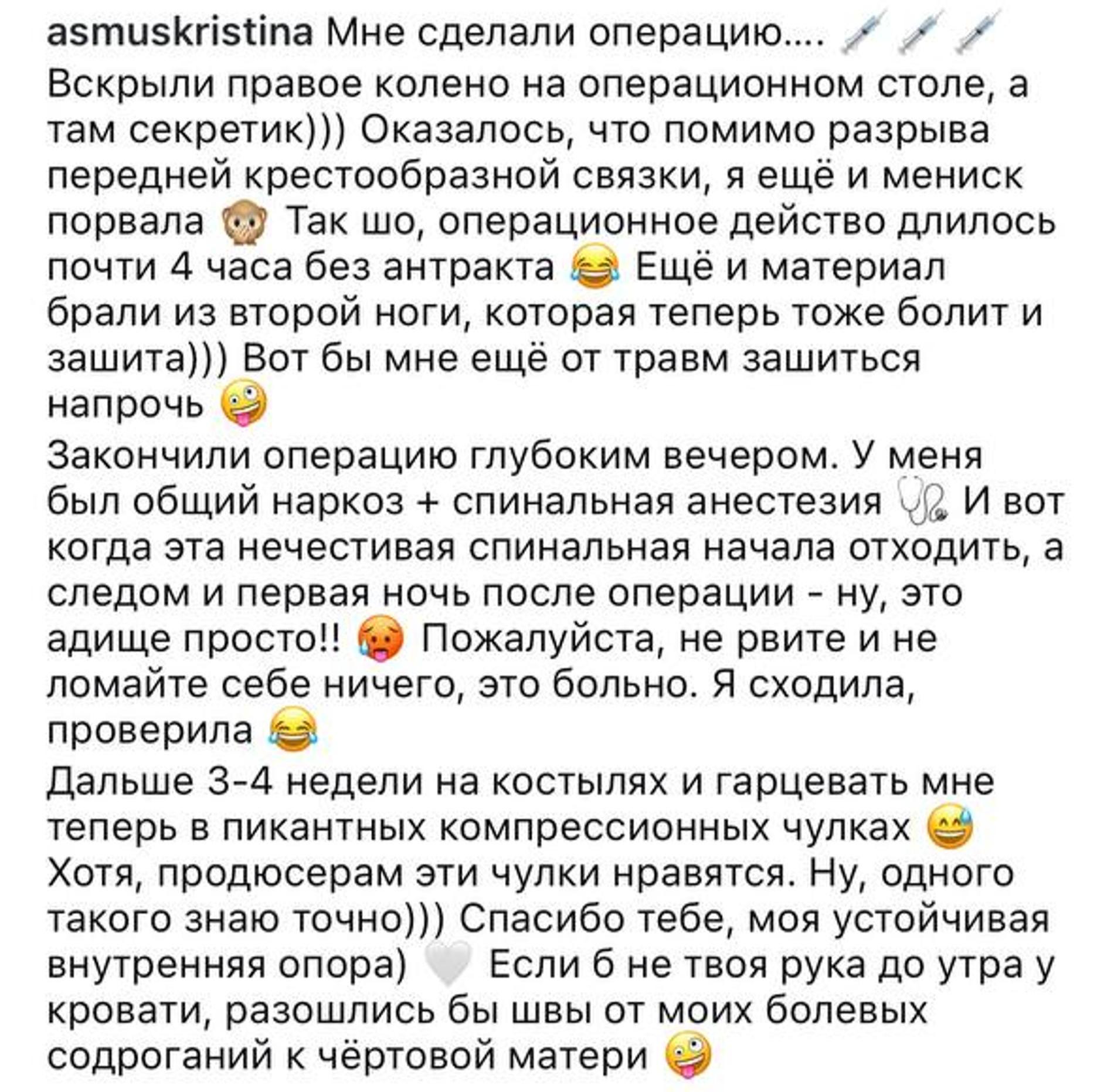 Актриса рассказала, что уже во время операции было обнаружено, что у нее не только разрыв связки. «Вскрыли правое колено на операционном столе, а там секретик. Оказалось, что помимо разрыва передней крестообразной связки я еще и мениск порвала», — поделилась Асмус. По словам Кристины, самочувствие после операции было, мягко говоря, не очень: анестезия начала отходить уже глубокой ночью, предоставив девушке по-настоящему адские ощущения. Впрочем, судя по тону поста, юмор даже в такой ситуации не оставляет Асмус — а потому надеемся, что уже совсем скоро актриса пойдет на поправку.