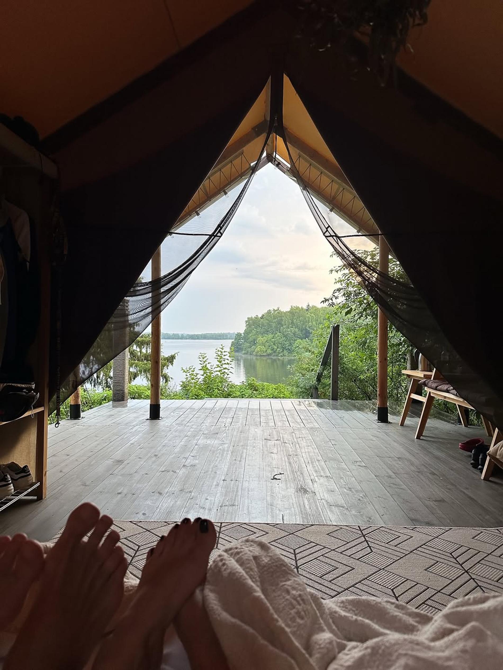 «Это было превосходное решение. Вместо кинофестивалей и раутов… Палатки, лес, сапы, ледяные купели, баня в чаще леса, собирание ягод, три дня спорта на улице, ужин на пирсе, маршмеллоу на костре, катамараны и любимые лапы рядом — аж 8 штук», — подписала Асмус серию романтичных кадров.