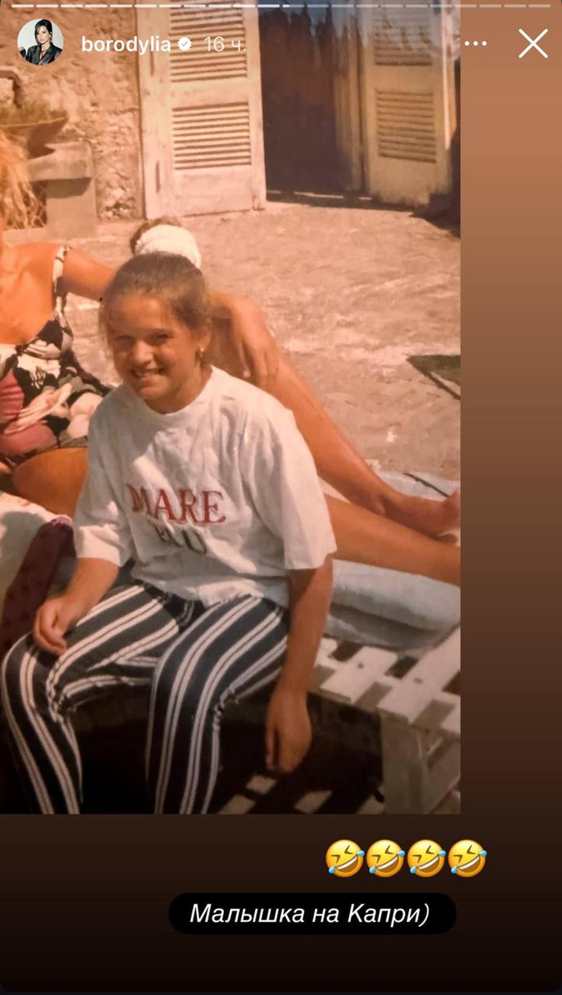 Вспоминая то беззаботное время, Бородина опубликовала в сторис редкие детские кадры. На фото будущая звезда — девочка в белой футболке и полосатых черно-белых штанах — улыбается в камеру. «Малышка на Капри», — написала Ксения, добавив несколько смеющихся эмодзи.