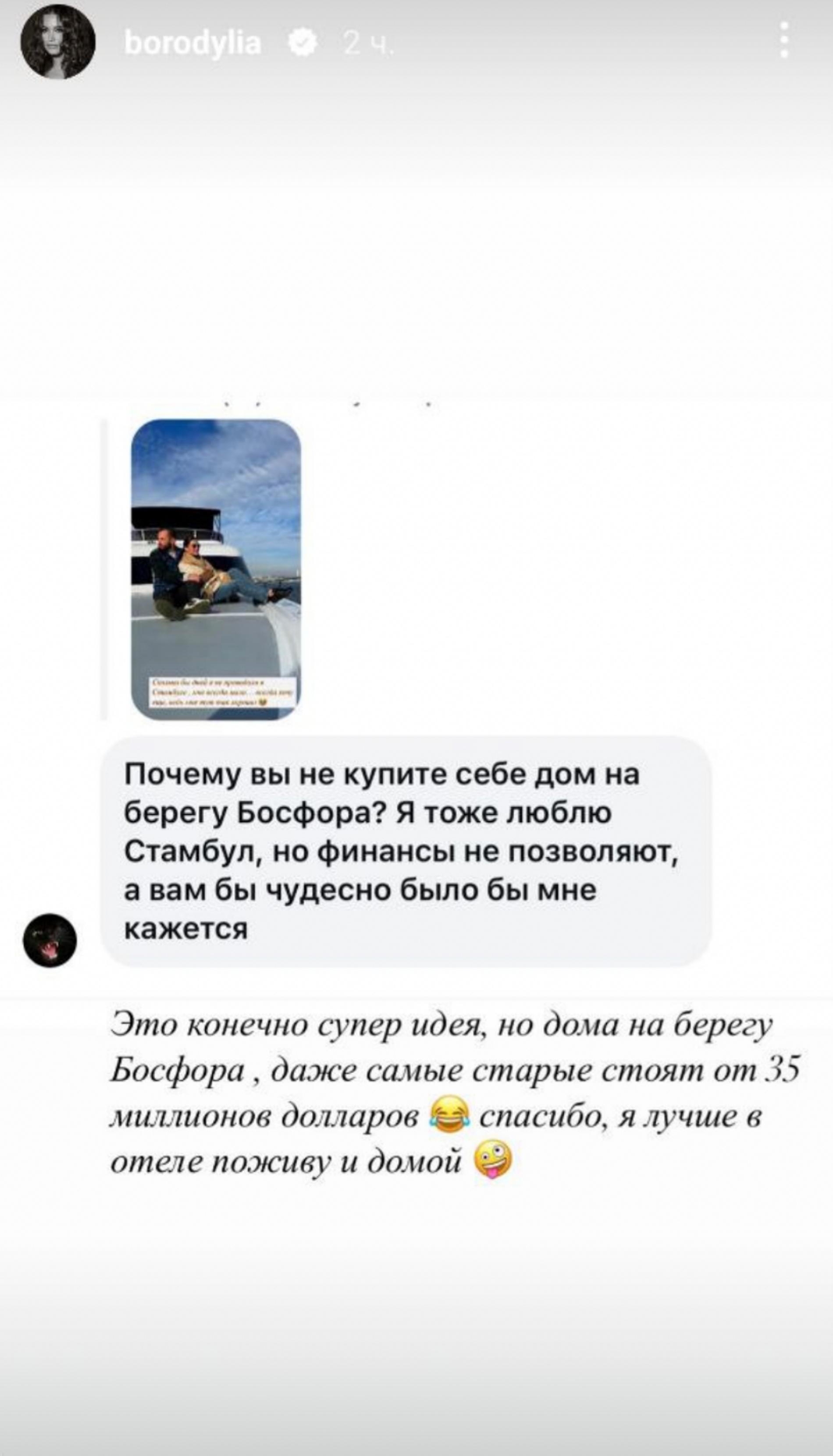 Буквально каждый снимок и ролик Ксения сопровождает признаниями в любви Стамбулу. В связи с этим одна из подписчиц поинтересовалась у телеведущей, почему она все еще не приобрела недвижимость в любимом городе? «Почему вы не купите себе дом на берегу Босфора? Я тоже люблю, но финансы не позволяют. А вам чудесно было бы, мне кажется», — обратились к Ксении в директе. Звезда дала понять, что и для нее такое приобретение — непозволительная роскошь.