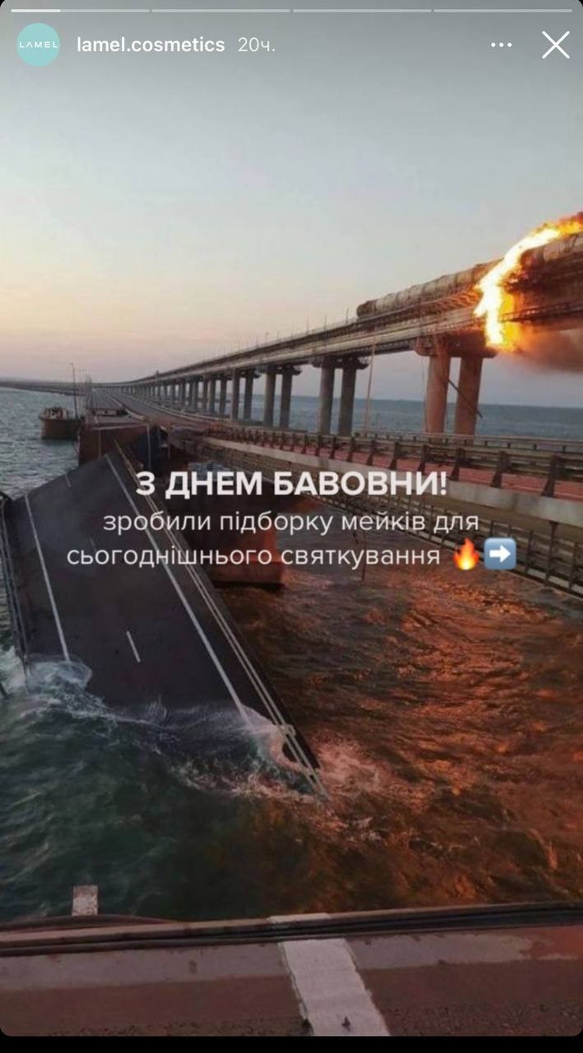 8 октября, в день подрыва Крымского моста, в Инстаграме* бренда декоративной косметики Lamel появились ситуативные посты на тему. Администраторы аккаунта опубликовали в сториз фотографию горящего моста, сопроводив его подписью «С днем хлопка», и подборку мейков с «огненными» стрелками по мотивам произошедшего. Судя по всему, таким образом бренд решил выразить поддержку Украине и ВСУ.