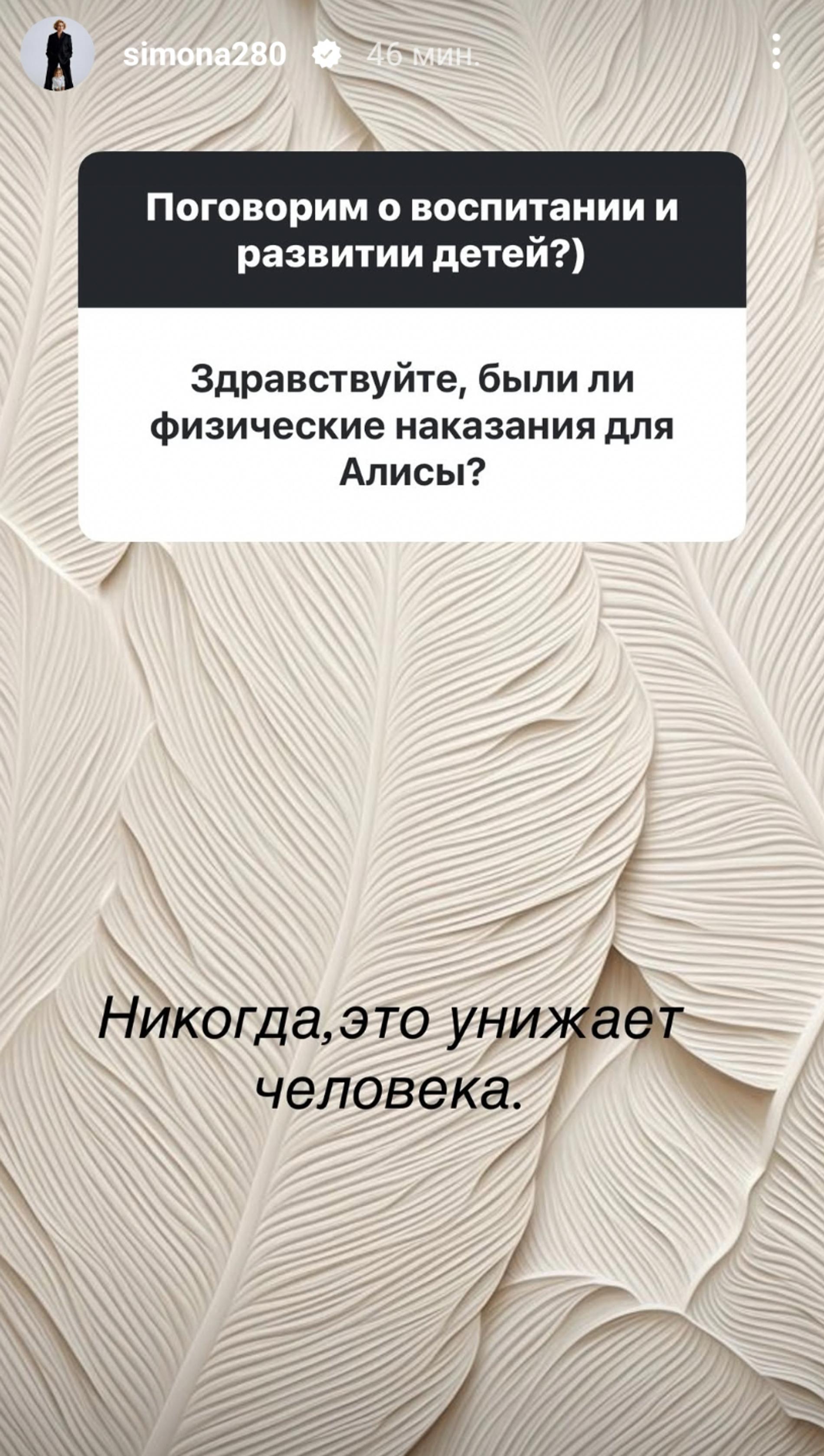 Второй день Симона Юнусова отвечает на вопросы подписчиков. Правда, на этот раз только на одну тему: воспитание детей. Так что свежей порции подробностей личной жизни ее звездного сына и его отношений с женщинами нам в этот раз не видать. Зато Симона Яковлевна ответила на пару вопросов о внучке Алисе, с которой она проводит много времени с рождения и активно занимается ее воспитанием и развитием. Так, например, у мамы рэпера спросили, знакомы ли Алисе физические наказания.
