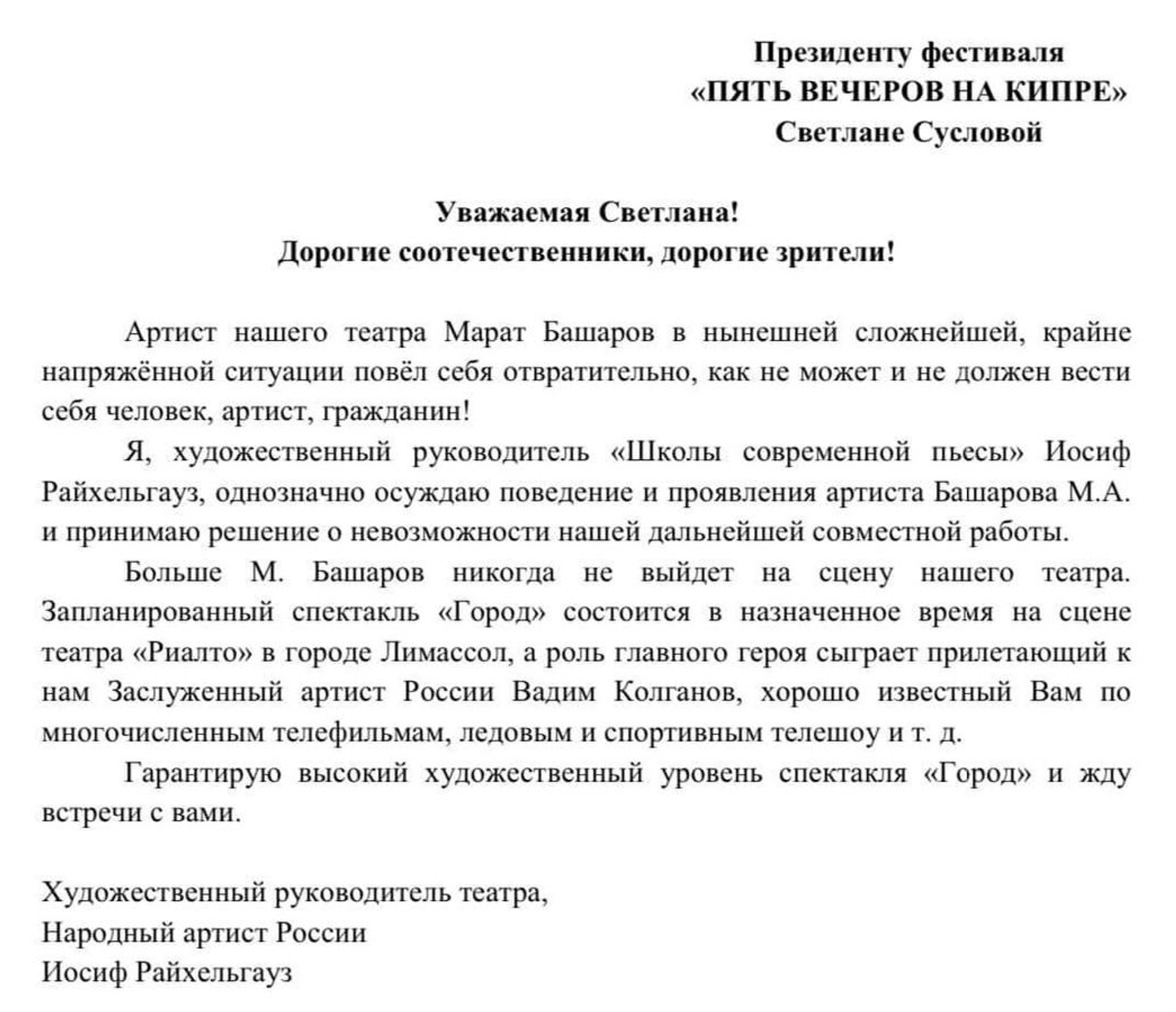 Художественный руководитель «Школы современной пьесы» Иосиф Райхельгауз публично уволил актера Марата Башарова. В своём заявлении режиссёр отметил «отвратительное» поведение артиста в «нынешней ситуации» и объявил, что в стенах театра ему не место.