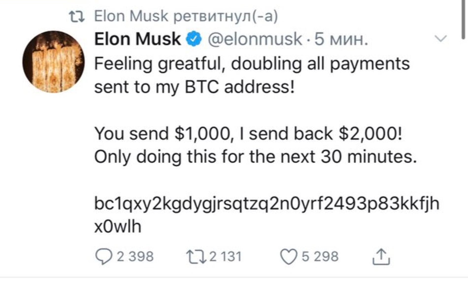 В социальной сети генерального директора Tesla появился пост о том, что в течение часа присланные на определенный адрес биткоины будут удвоены: