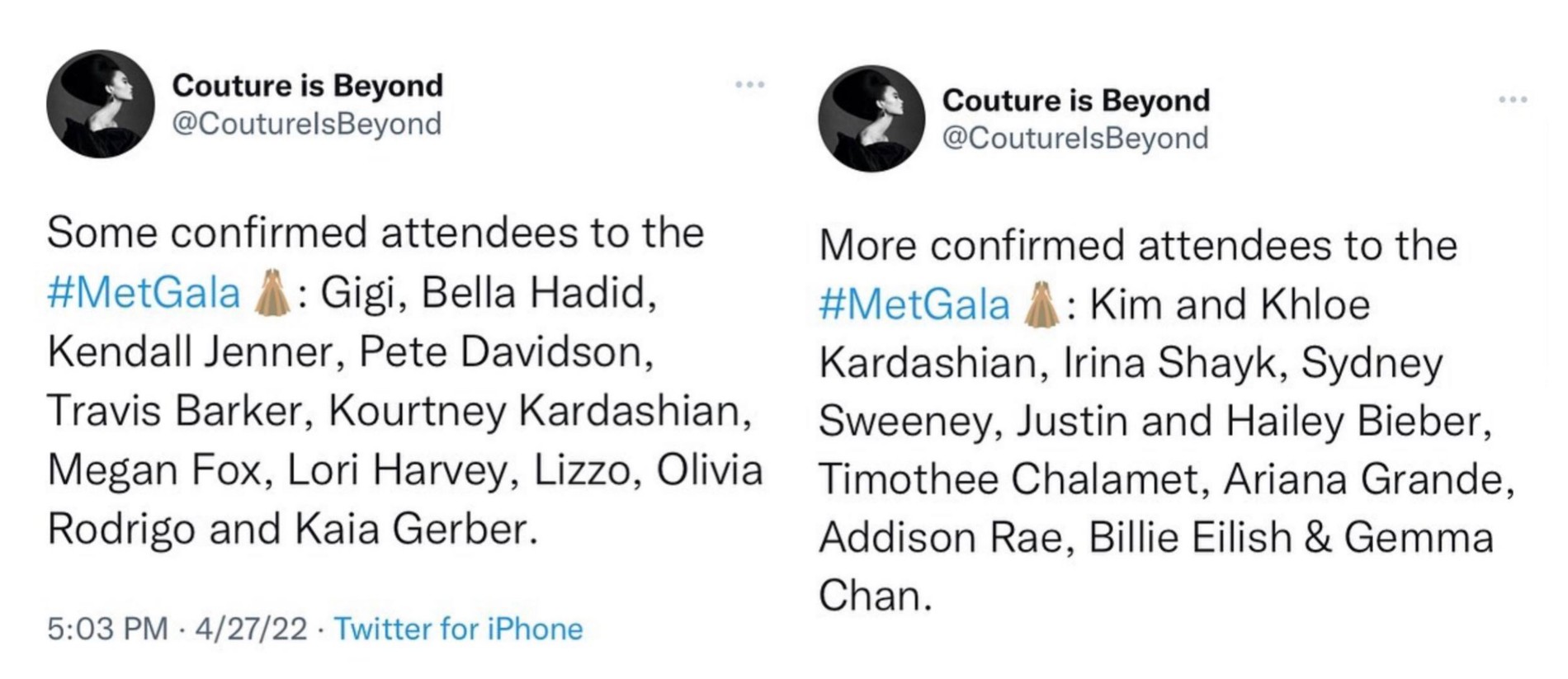 Частичный список подтвержденных гостей уже появился в Twitter. На Met Gala 2 мая обещают присутствие Тимоти Шаламе, Арианы Гранде, сестер Хадид, семьи Кардашьян (Ким будет с Питом), Меган Фокс, певицы Лиззо, Джастина и Хейли Бибер, Ирины Шейк. Среди молодых гостей пригласили звезду «Эйфории» Сидни Суини, Билли Айлиш, а также американскую тиктокершу Эддисон Рэй.