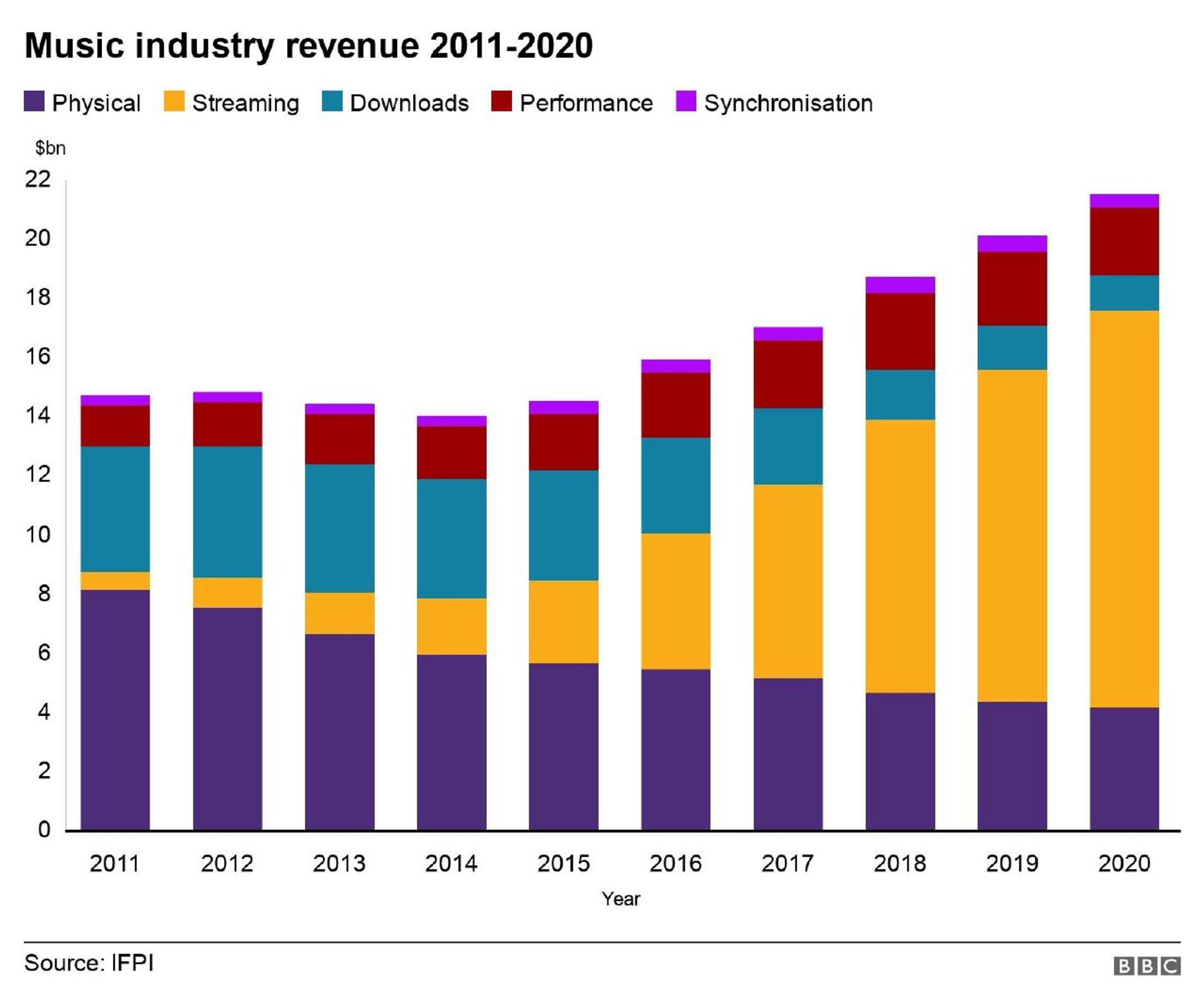 Музыкальная индустрия за 2020 год стала ощутимо богаче. Несмотря на коронавирус, а может, и благодаря ему, доходы мировой музыки составили 21,6 миллиона долларов. Эта сумма стала самой большой с 2002 года. Наибольшую выручку ожидаемо принесли стриминг-сервисы, ставшие спасением для всех, кто из-за пандемии не мог ходить на концерты любимых исполнителей.