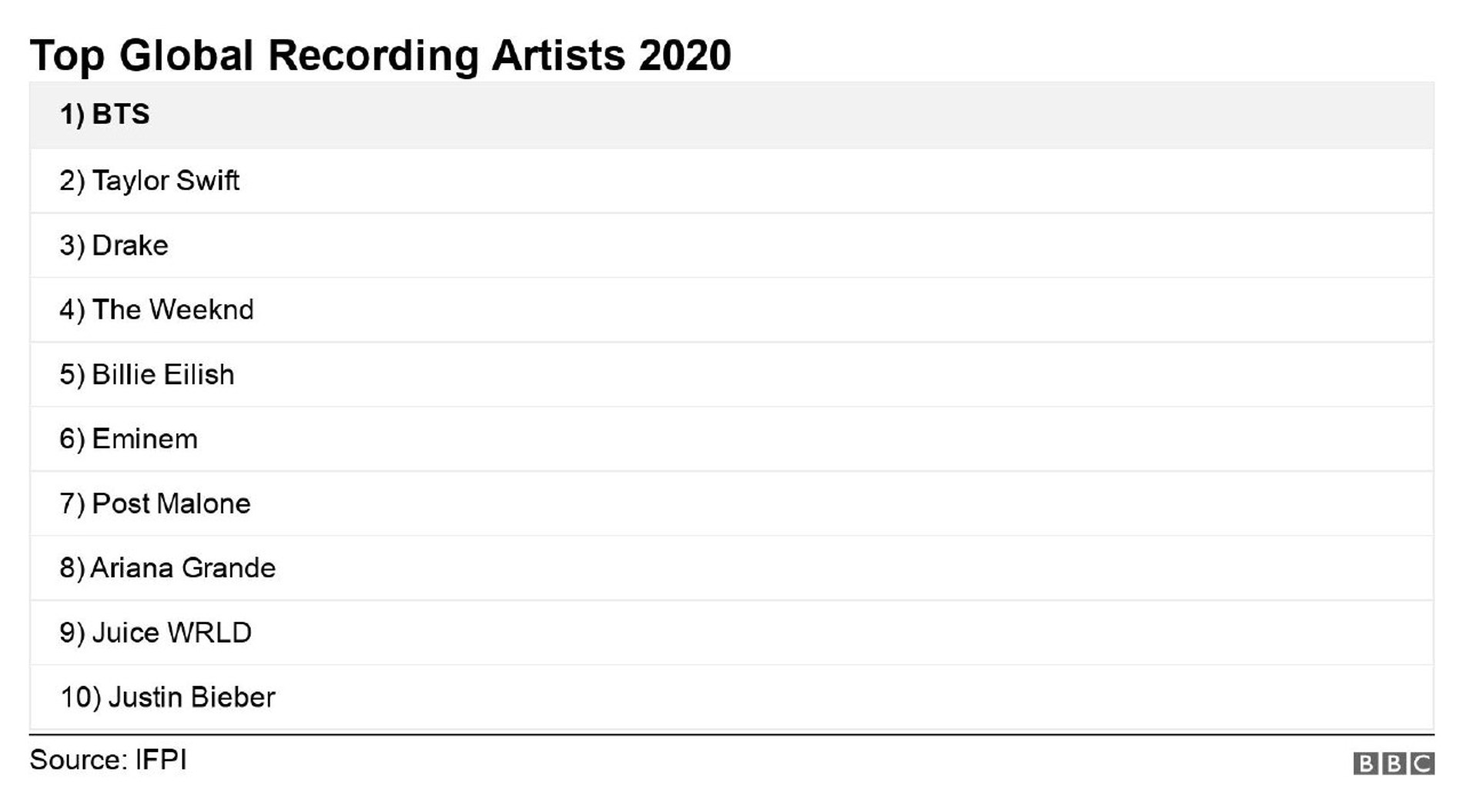 В списке самых популярных артистов минувшего года первую строчку заняла южнокорейская группа BTS. Второе место осталось за певицей Тейлор Свифт, а третье — за рэпером Дрейком.