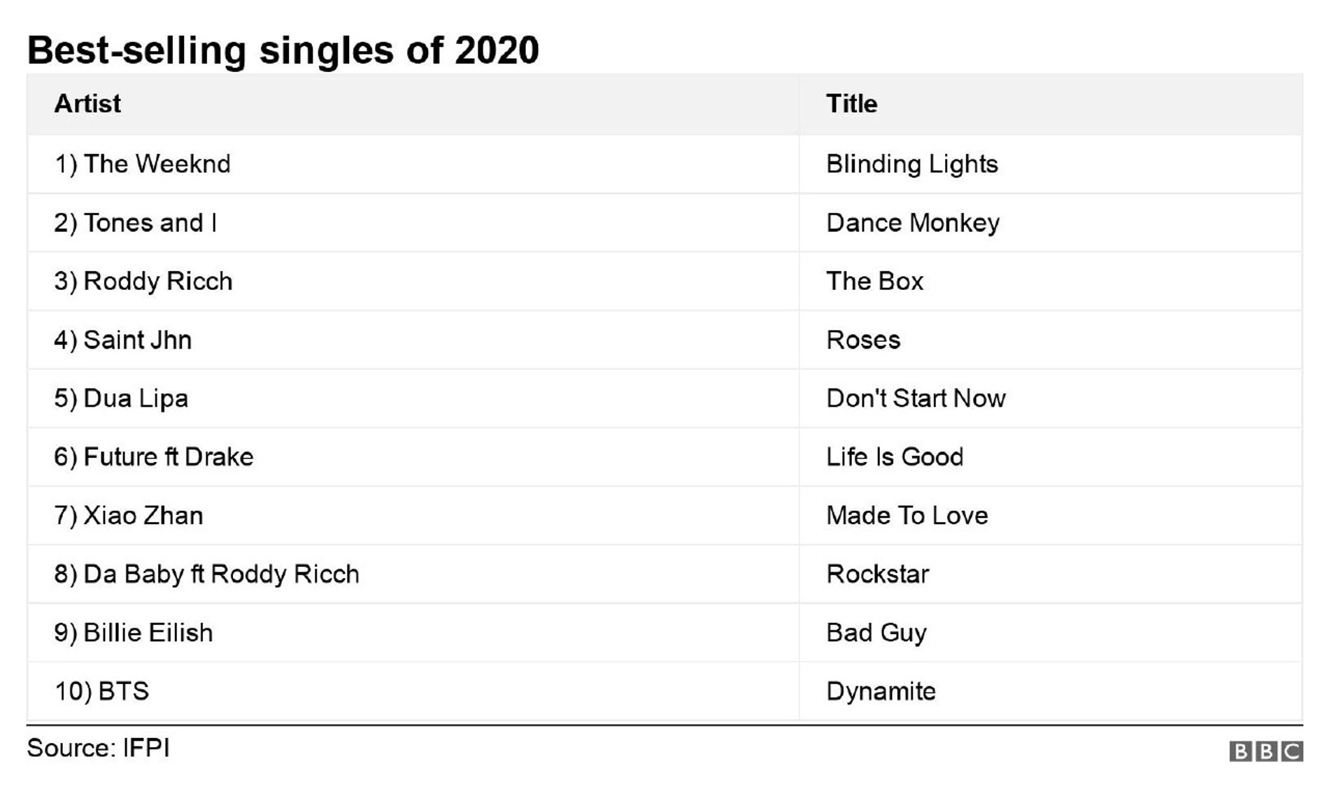 Топ лучших синглов года возглавил The Weeknd, само собой, с разорвавшим все ротации Blinding Lights. А вот второе и третье место могут удивить широкую аудиторию: их заняли Tones and I и Roddy Ricch с синглами Dance Monkey и The Box соответственно.