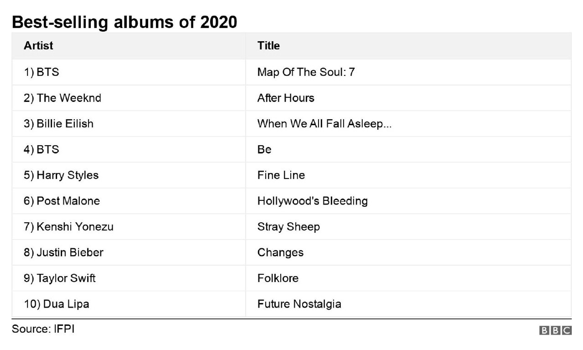 Корейская группа BTS впервые в истории заняла первое место в списке лучших альбомов, причем сразу два релиза кейпоперов оказались в топ-10: на вершине рейтинга расположился Map of the Soul: 7, а на четвертом месте — их альбом Be. Второе место занял суперуспешный альбом The Weeknd — After Hours, а замкнула тройку Billie Eilish со своим When We All Fall Asleep.