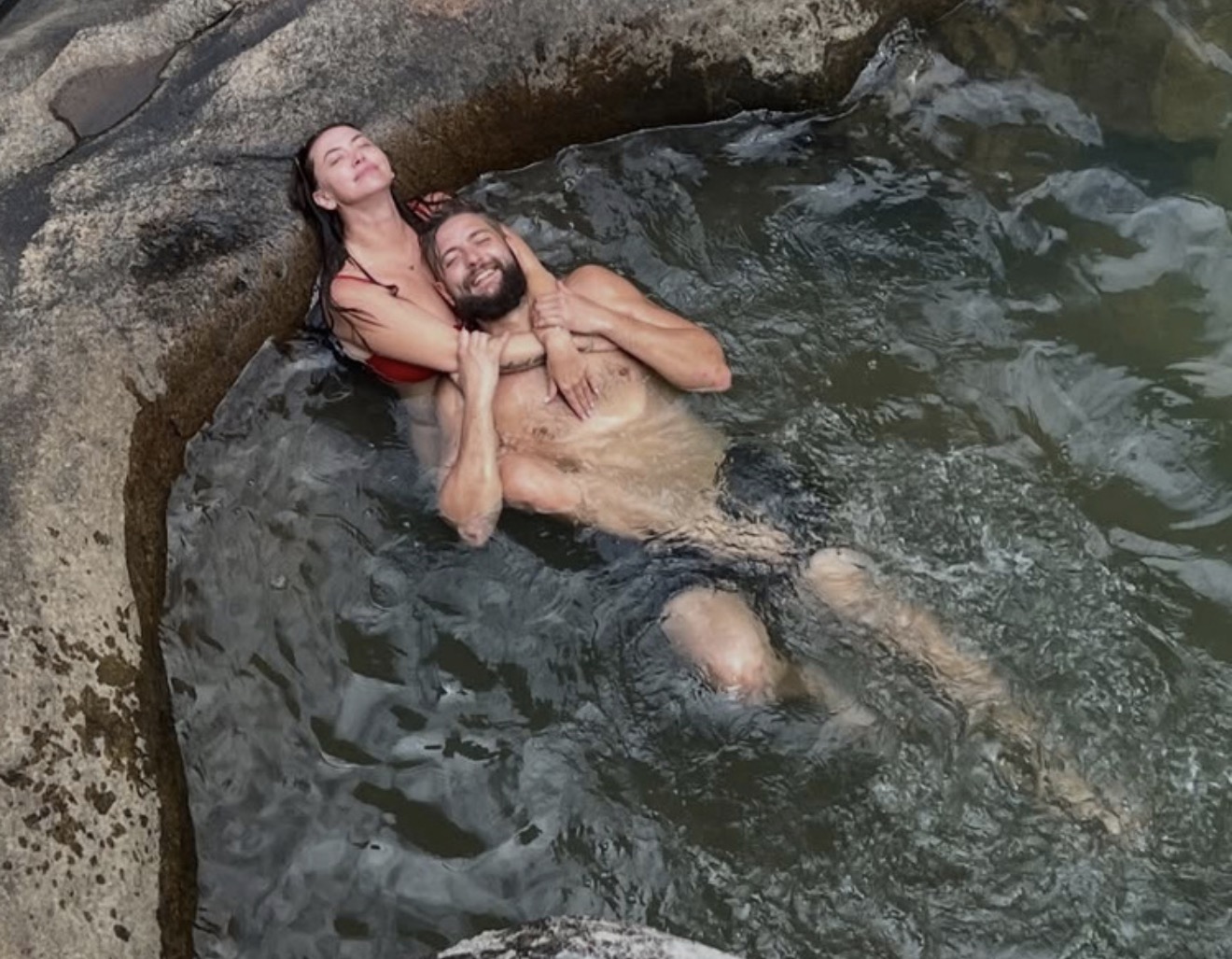 На одном из кадров пара обнимается во время купания неподалёку от живописных скал.