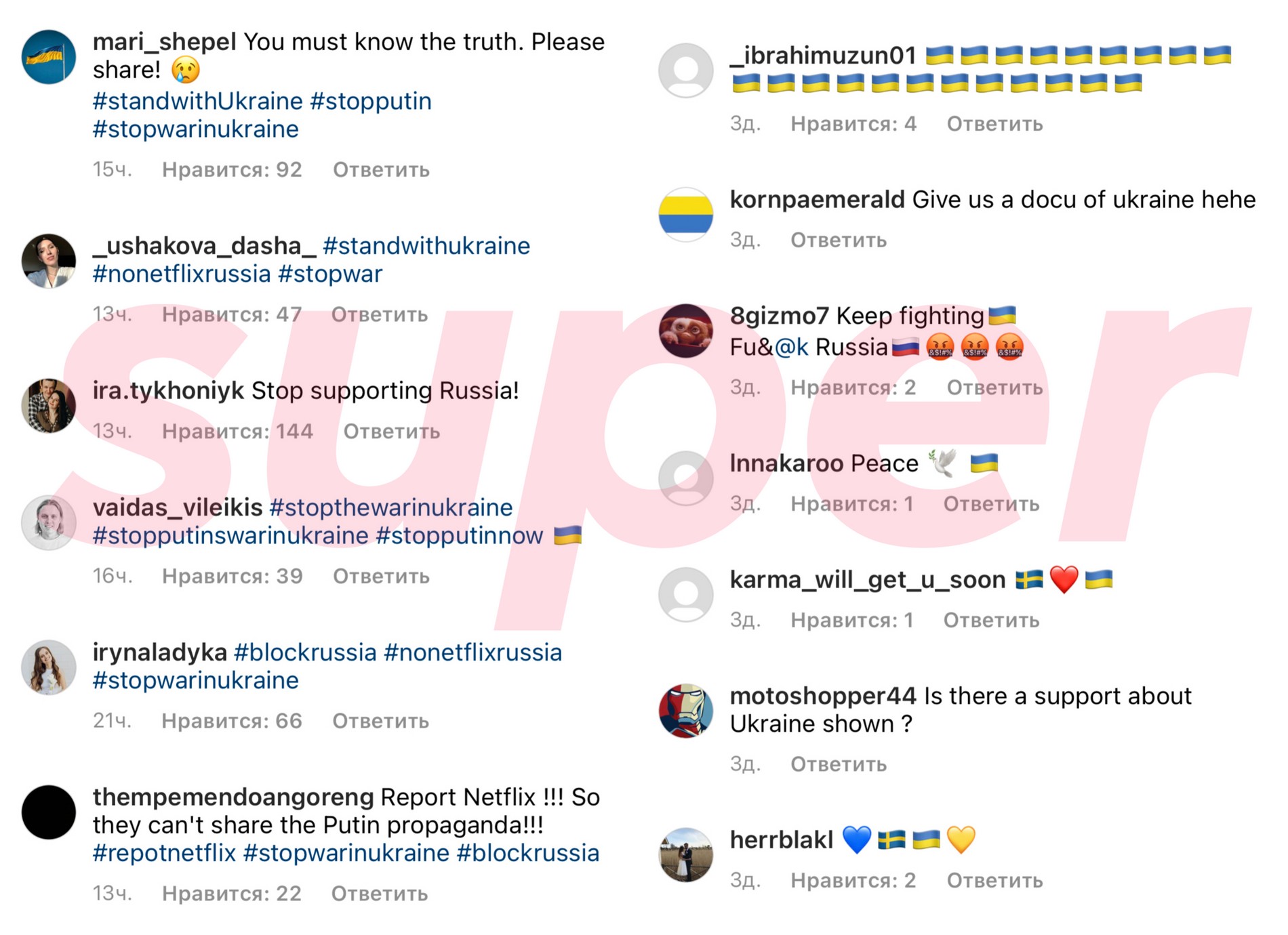 В украинском и российском аккаунтах Netflix люди массово присылают эмодзи с флагом Украины, ставят хештеги с призывом убрать Netflix в России и остановить военные действия.