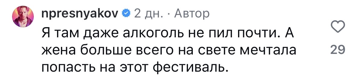 Пресняков продолжает называть бывшую супругу «женой». Артист ответил на комментарий подписчика под своим постом в запрещённой сети о впечатлениях от фестиваля Burning Man и упомянул, что Алёна Краснова всегда мечтала побывать там.