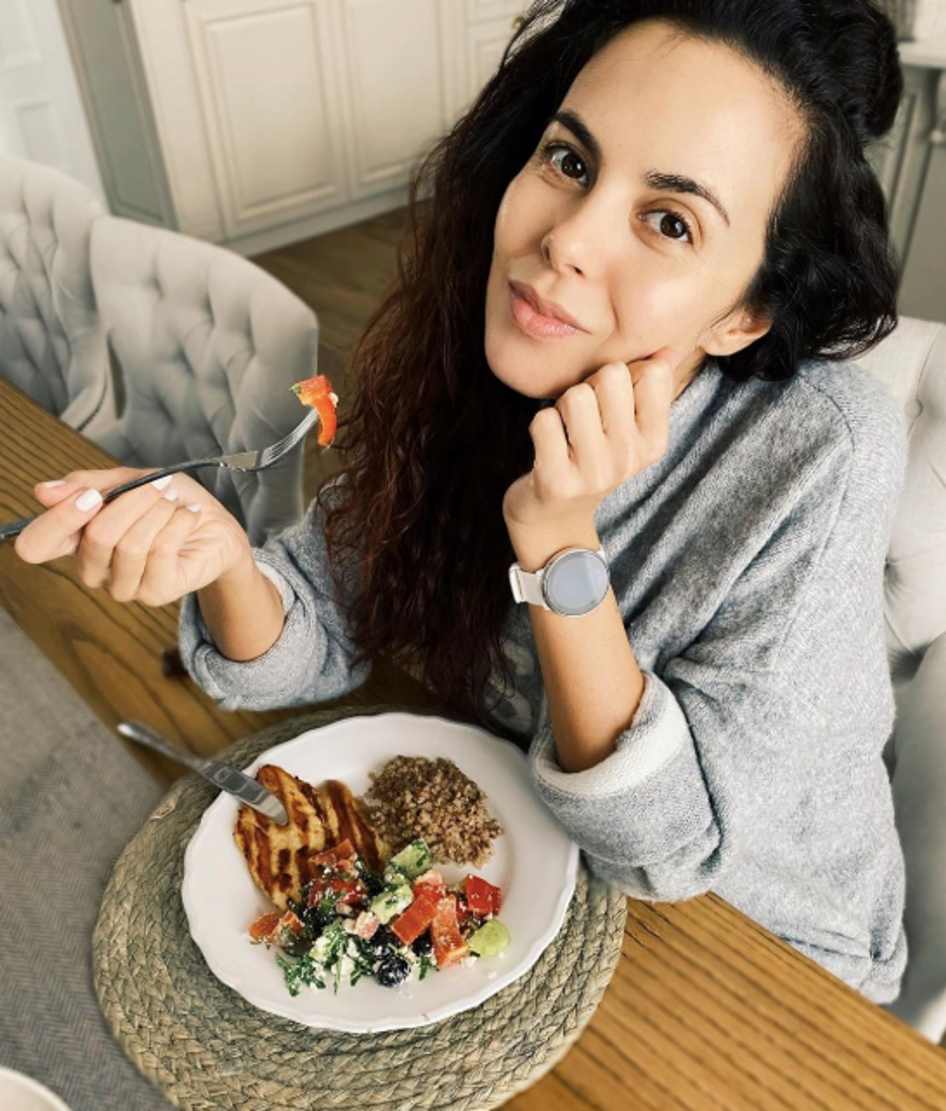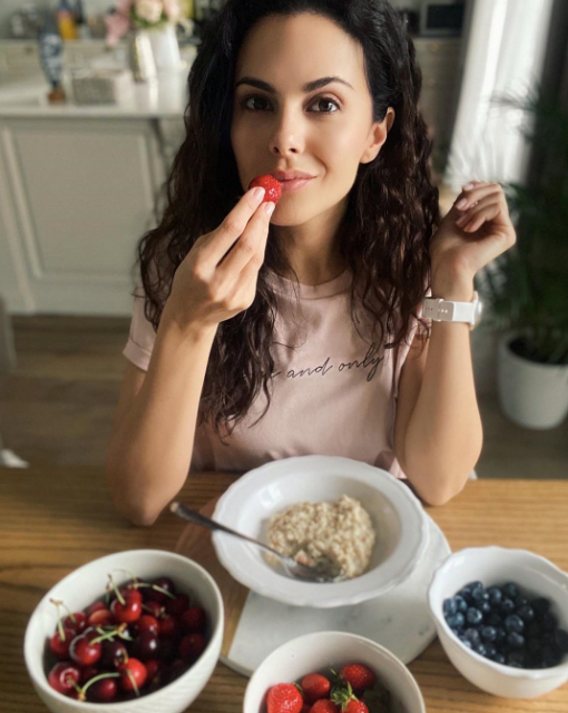 Спорт и правильное питание стали неотъемлемой частью моей жизни, поэтому «придерживаться» уже не приходится, все происходит по наитию. Я ем дробно: 5 раз в день в одно и то же время. Таким образом вырабатывается пищевая привычка, и это положительно влияет на скорость обмена веществ. Порции у меня всегда нормального размера, организм должен получать все необходимое. На завтрак часто овсянка или овечий йогурт без добавок, но с ягодами или фруктами, можно также добавить орехи. Второй завтрак — омлет с авокадо или огурцом плюс любая зелень по вкусу: рукола, салат, базилик и т.д. На обед что-то обязательно белковое — курица, говядина или рыба с гарниром и салатом из овощей. На ужин — птица или рыба с салатом, а также 150 граммов творога на второй перекус. За день я позволяю себе одну чашку чая и чашку кофе с растительным молоком. В остальное время пью чистую воду в достаточном количестве. За питанием слежу и на гастролях, а тренироваться не всегда получается полноценно, но я всегда найду возможность поприседать или постоять в планке. Главное — желание.
