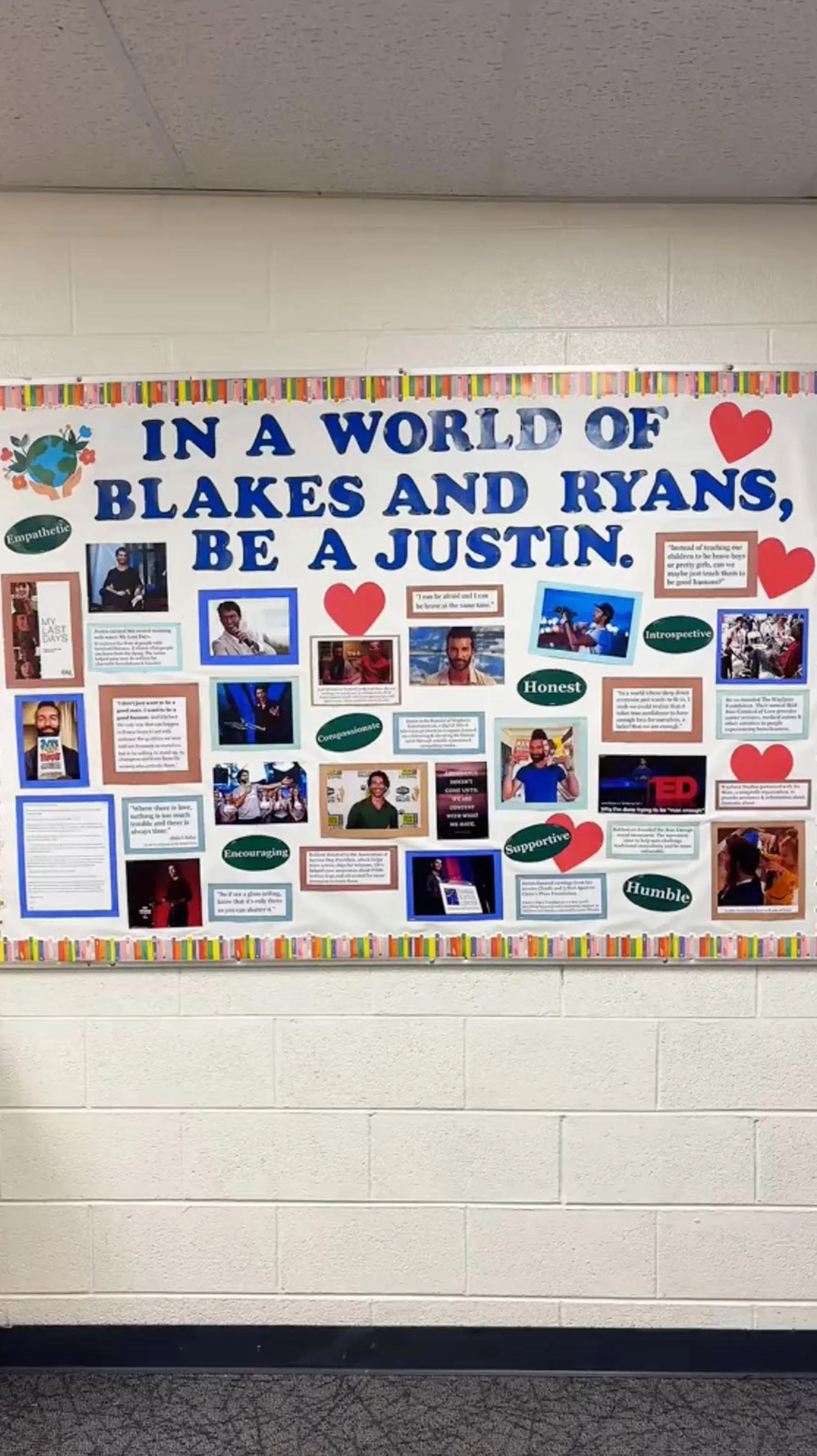 На фотографии также изображен плакат со множеством фотографий Джастина, к каждой из которых приписано какое-то качество актера: поддерживающий, честный, скромный или чуткий. Кроме того, на плакате размещены слова Бальдони о женщинах, которые он говорил на протяжении многих лет. Видимо, таким образом Сэм дал понять, что его сын не способен на те жуткие вещи, о которых говорит Блейк.