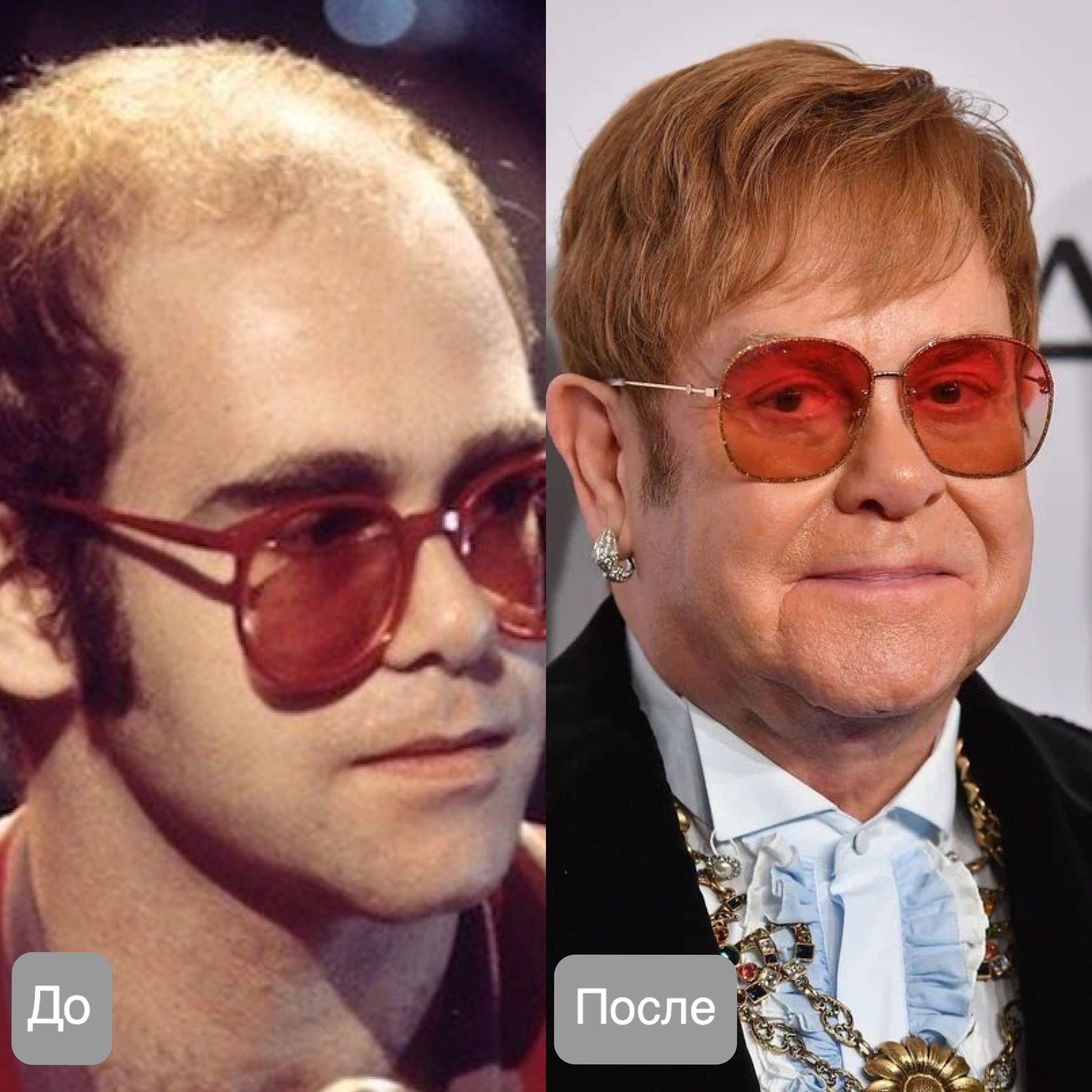 Элтон Джон своего опыта не стесняется и неоднократно о нем рассказывал. Проблема с волосами у звезды началась еще в 70-е — масла в огонь подливали регулярные окрашивания. После одной неудачной покраски в Нью-Йорке, как рассказывал сам певец, он почти полностью облысел. По словам Джона, трансплантация ему не помогла. В этом он винит свое чрезмерное увлечение наркотиками и невнимательное отношение к рекомендациям (музыкант носил шляпу). Вот не послушал доктора, теперь приходится носить парики и шиньоны.