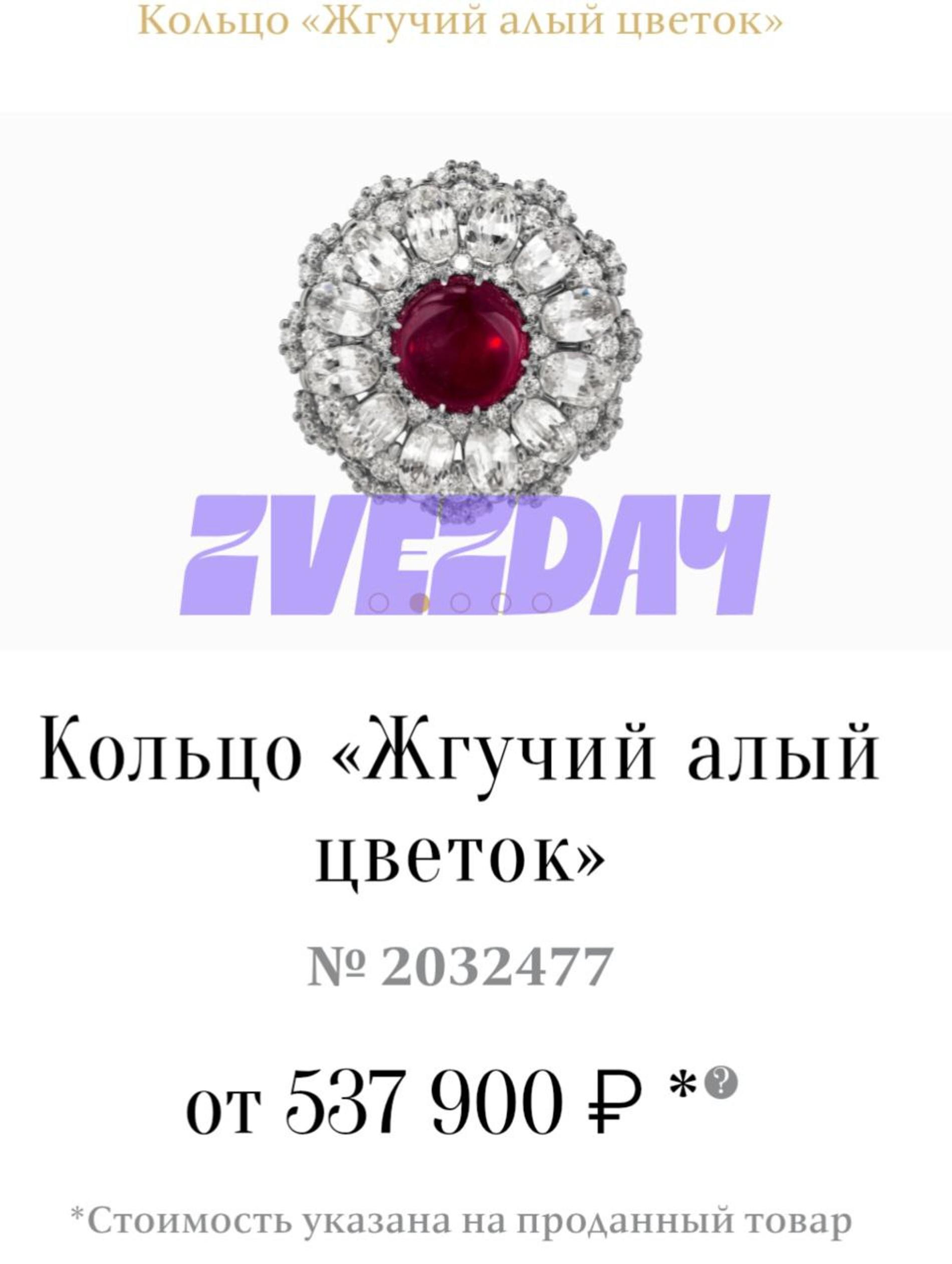 По информации Telegram-канала Звездач, стоимость украшения с рубином и бриллиантами составила примерно 540 тысяч рублей. «Пока смотрели рынок, видели похожие экземпляры и за несколько миллионов», — отметили в издании.