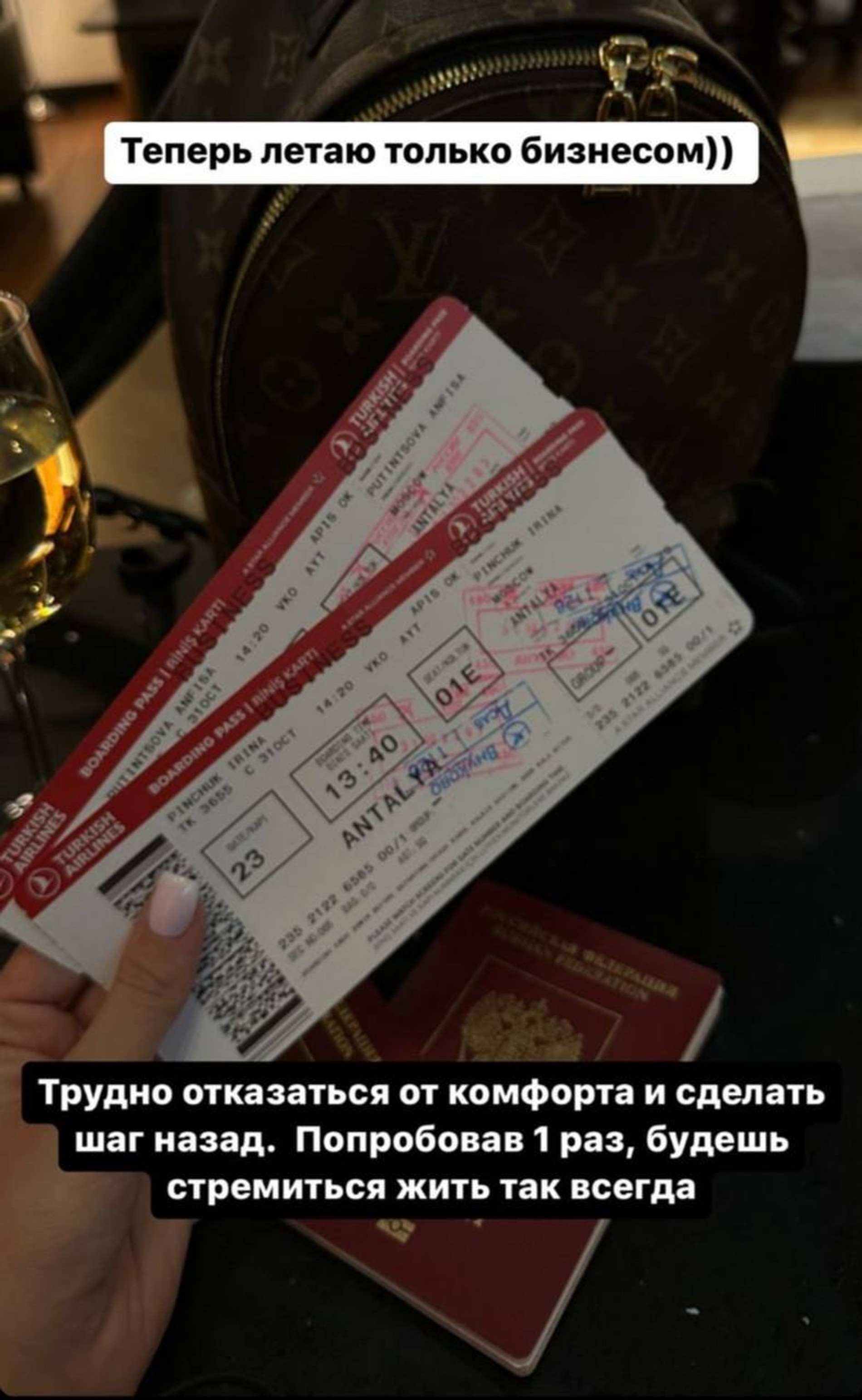 Девушка не забыла упомянуть, что летает бизнес-классом не впервые. Следом звезда выложила фотографию двух посадочных талонов и объяснила, почему не выбирает эконом: «Трудно отказаться от комфорта и сделать шаг назад, — рассказала в сторис Ирина. — Попробовав один раз, будешь стремиться делать так всегда». По приезде девушка сообщила, что проспала весь полет, и уехала в гостиницу на Rolls-Royce.