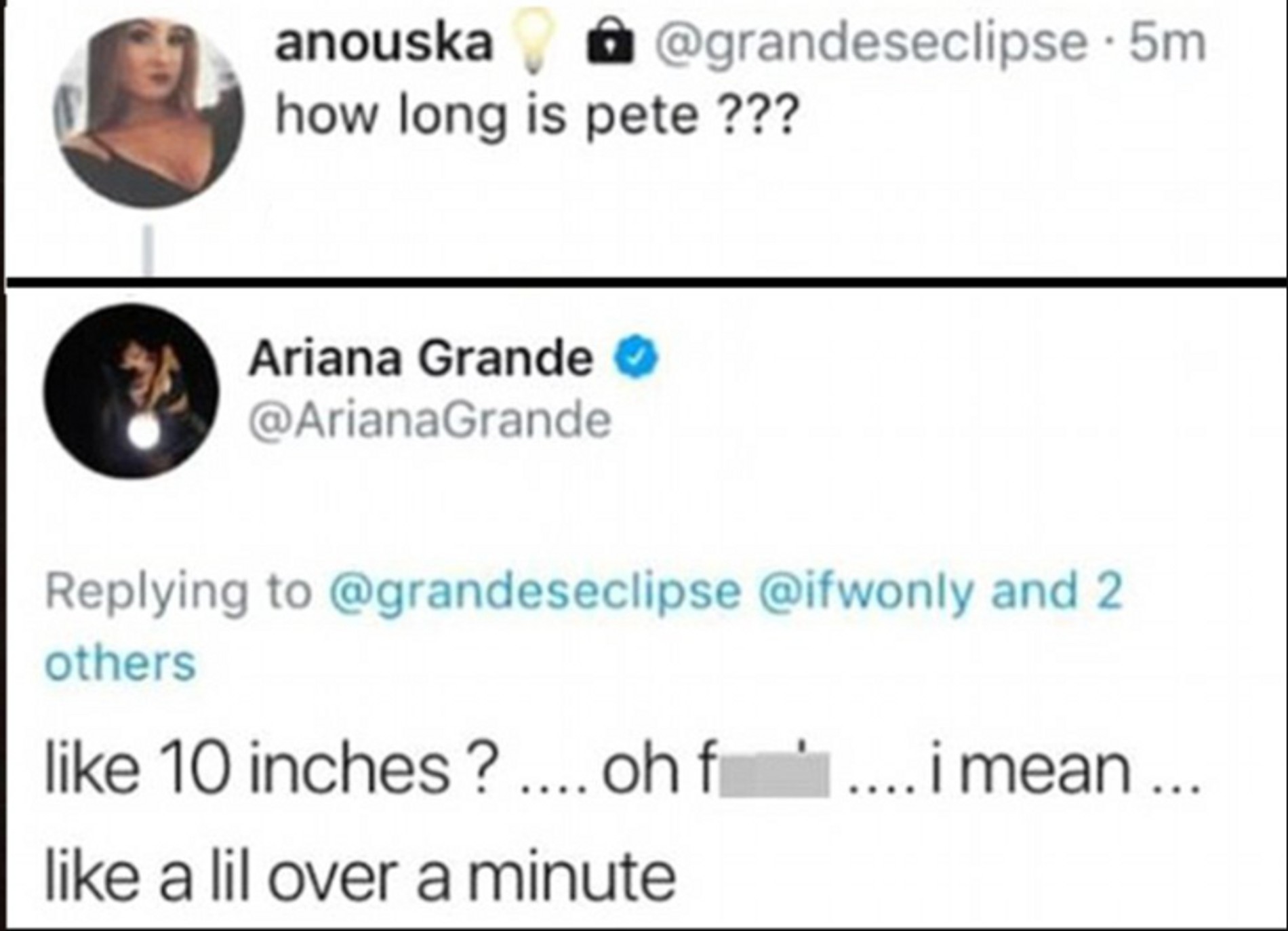 Когда Гранде расторгла помолвку с Питом, она не стала закатывать истерики и раздавать скандальные интервью. Вместо этого Ариана дважды прорекламировала бывшего перед его будущими избранницами. Сначала написала пост в Твиттере о размерах его полового органа, а потом упомянула добрым словом в хите Thank You, Next . В итоге за Дэвидсоном закрепилось прозвище Big Dick Energy. Сам парень этому не особо рад: «Мне не нравится, что она говорит, какого размера у меня член. Все девушки, которые видели его, были разочарованы».