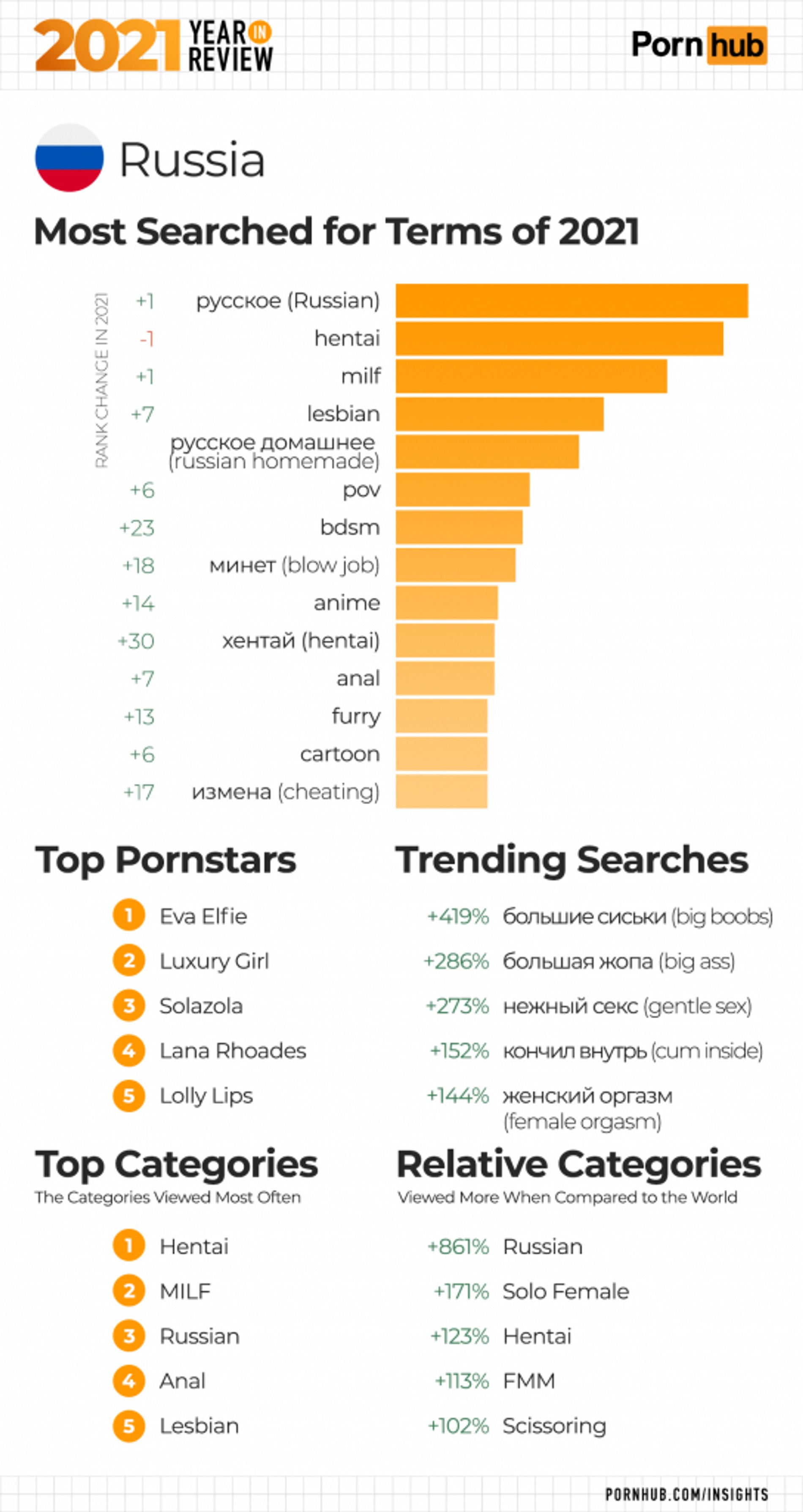 Россия заняла 18-е место из 20 стран по ежедневному трафику на Pornhub. Самым популярным поисковым запросом в 2021 году у россиян стал термин «русское», за ним последовали «хентай» и MILF. Российских женщин среди пользователей сервиса всего 29%. Чаще всего представительницы женского пола искали на Pornhub лесбийские ролики, видео с японками и из категории MILF. Самыми популярными порноактрисами в России стали Ева Эльфи, Luxury Girl, Solazola, Lana Rhoades и Lolly Lips. Согласно статистике, во время трансляции Евровидения трафик из России упал всего лишь на 4% против мальтийских 34%.
